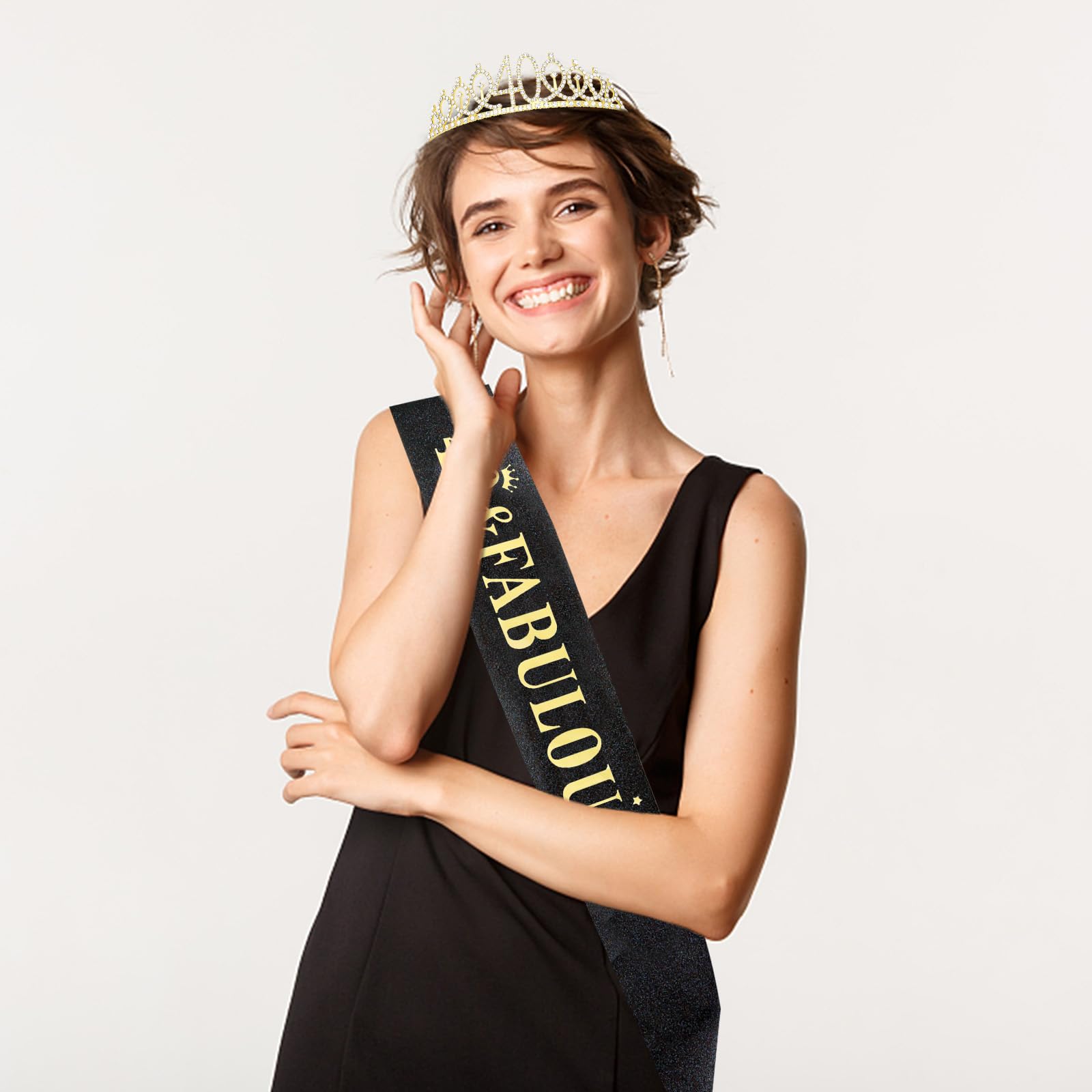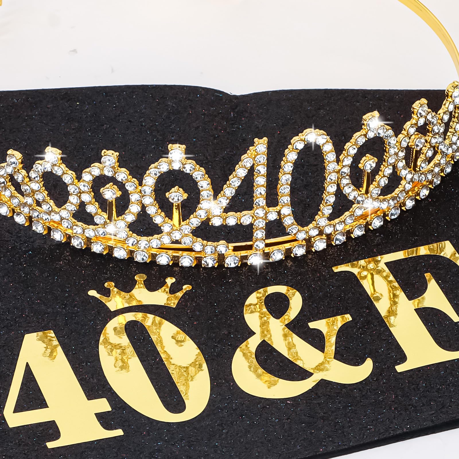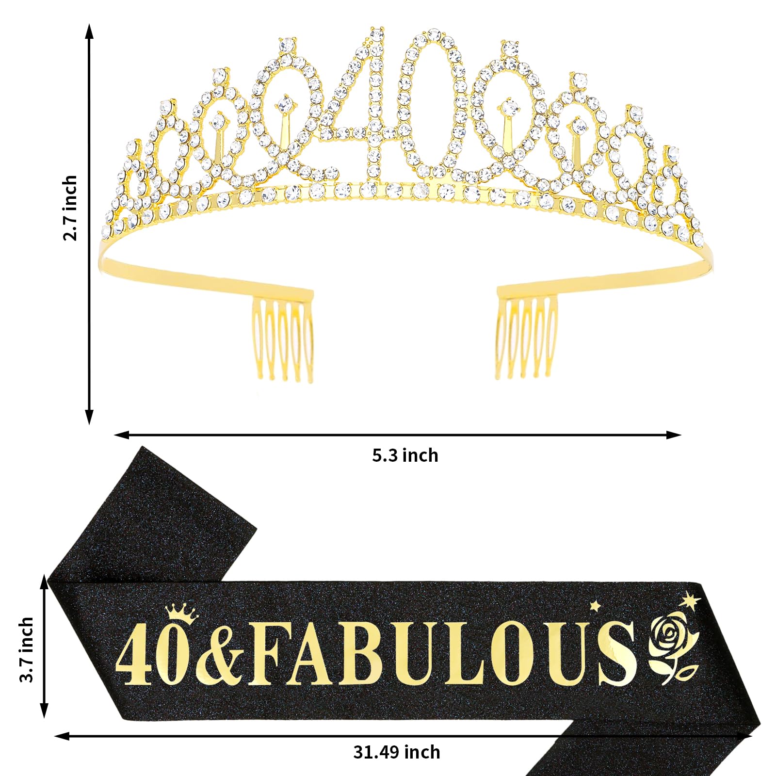 40 & Fabulous Birthday Sash: The tiara is made of glitter fabric and printed with gold foil words reads "40 & Fabulous". The sash is 62.98 inches long (31.49 inches when folded in half) and 3.7 inches wide