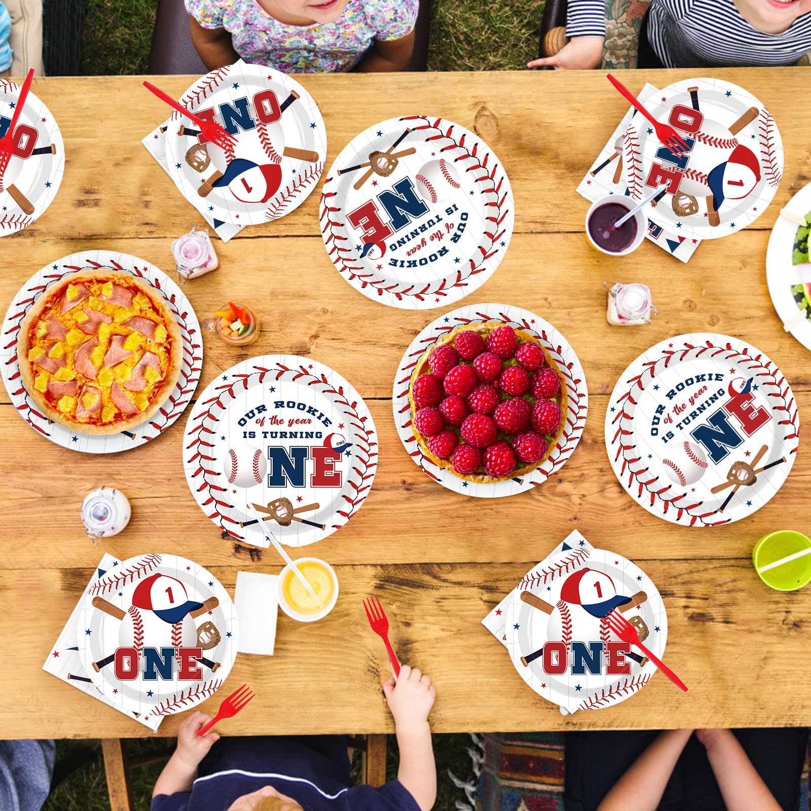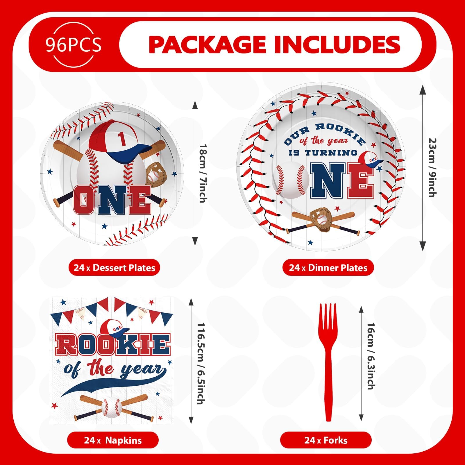 Baseball 1st Birthday Party Decorations: Our baseball 1st birthday dinnerware set included 24pcs 9'' baseball 1st birthday plates, 24pcs 7'' rookie of the year plates, 24pcs paper napkins. Using baseball 1st birthday party decorations will make your party more enjoyable