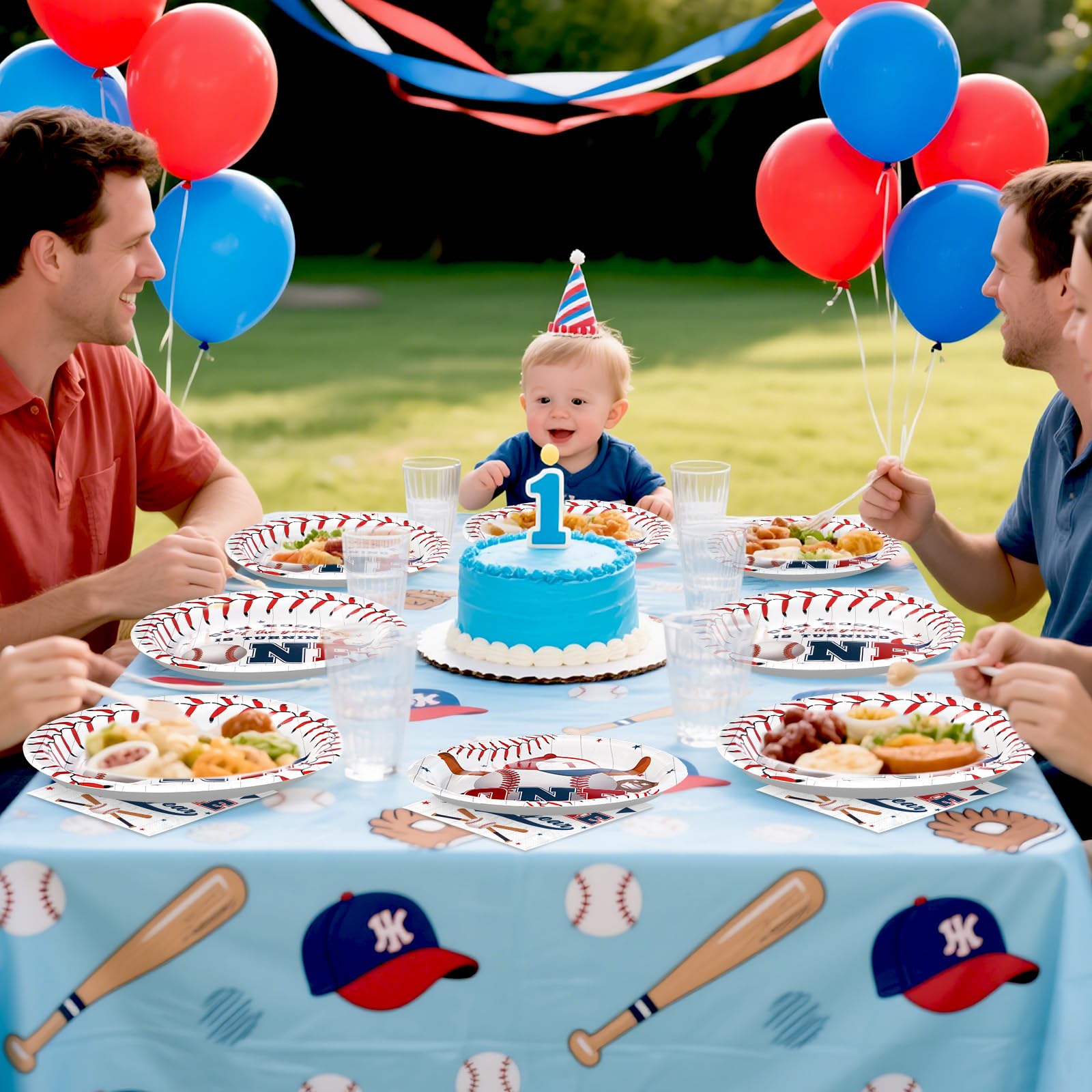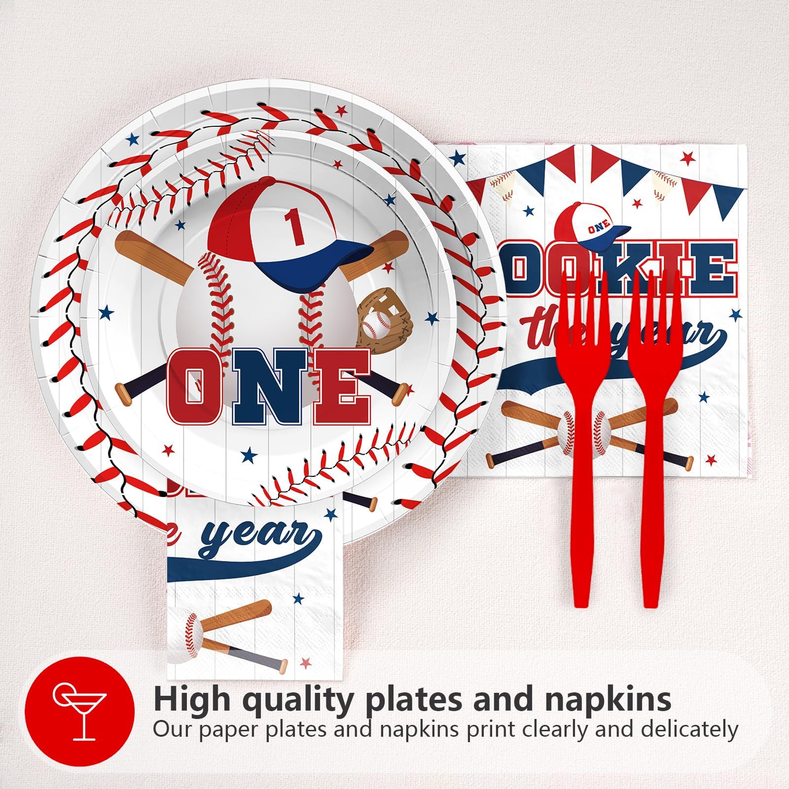 Unique Baseball Design: The baseball 1st birthday party plates and napkins feature classical baseball-themed colors including red, white and blue, combined with cute little baseball and baseball gloves designs, adorable with baseball elements, which are eye-catching and interesting, they will leave a deep impression on your guests