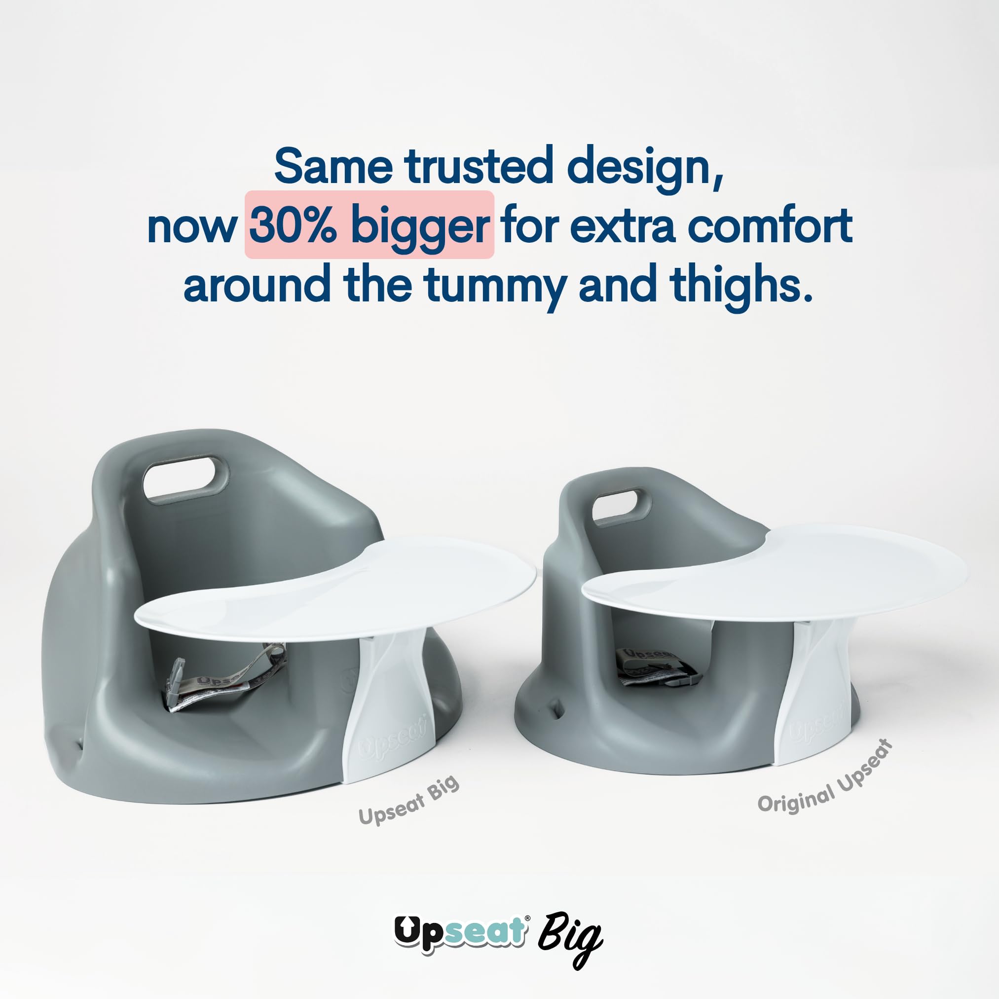 Designed with extra room for your growing baby, the Upseat Big is 30% bigger than the original Upseat, providing more comfort and support around the tummy and thighs. With wider leg openings, a deeper seat, and higher back support, this upgraded design ensures your little one is cozy and well-supported at every stage. Our trusted design, developed with input from physical therapists, promotes healthy hip positioning and upright posture, helping your baby sit up naturally while supporting their growth and development. The Upseat Big XL transitions seamlessly from floor seat to booster, complete with a removable, easy-to-clean tray that makes it ideal for playtime, snack time, or family meals.