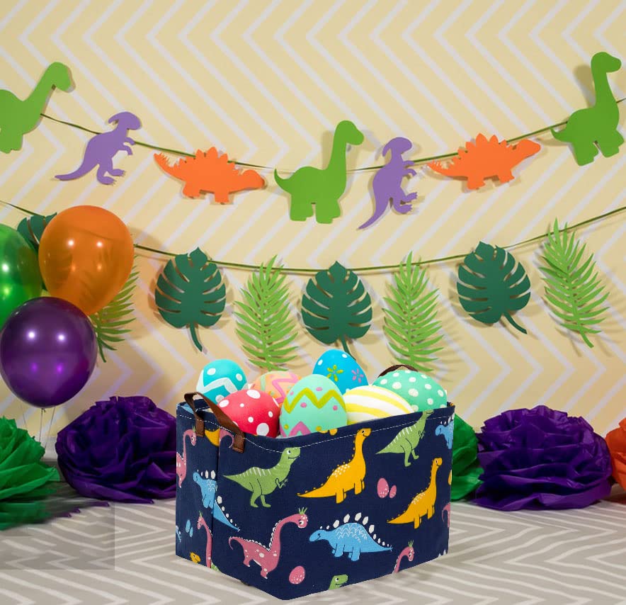 HIGH QUALITY MATERIALS: The dinosaur easter basket made of linen & canvas fabric with environmental protection waterproof PE coating.Foldable Shelf Basket convenient storage and space saving.