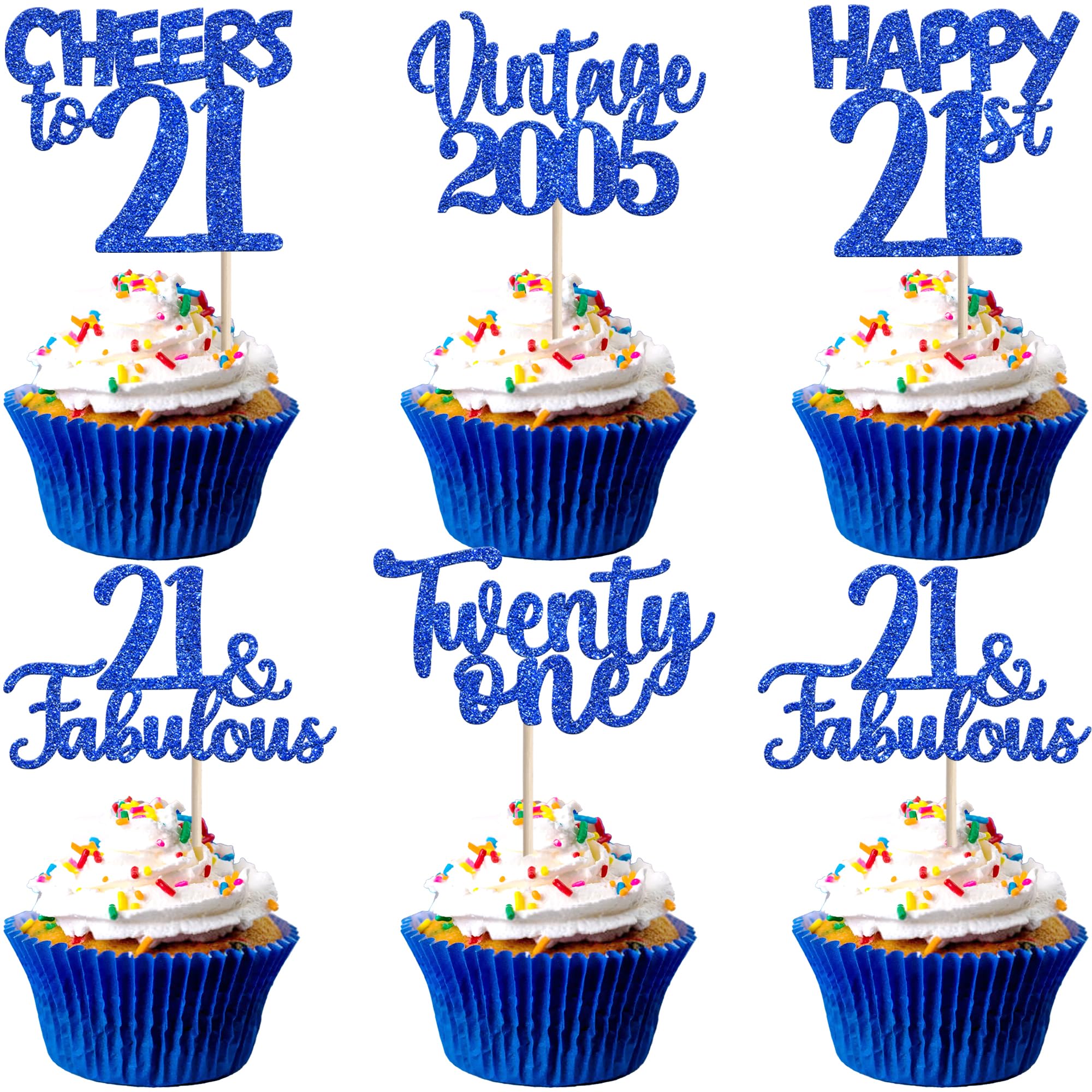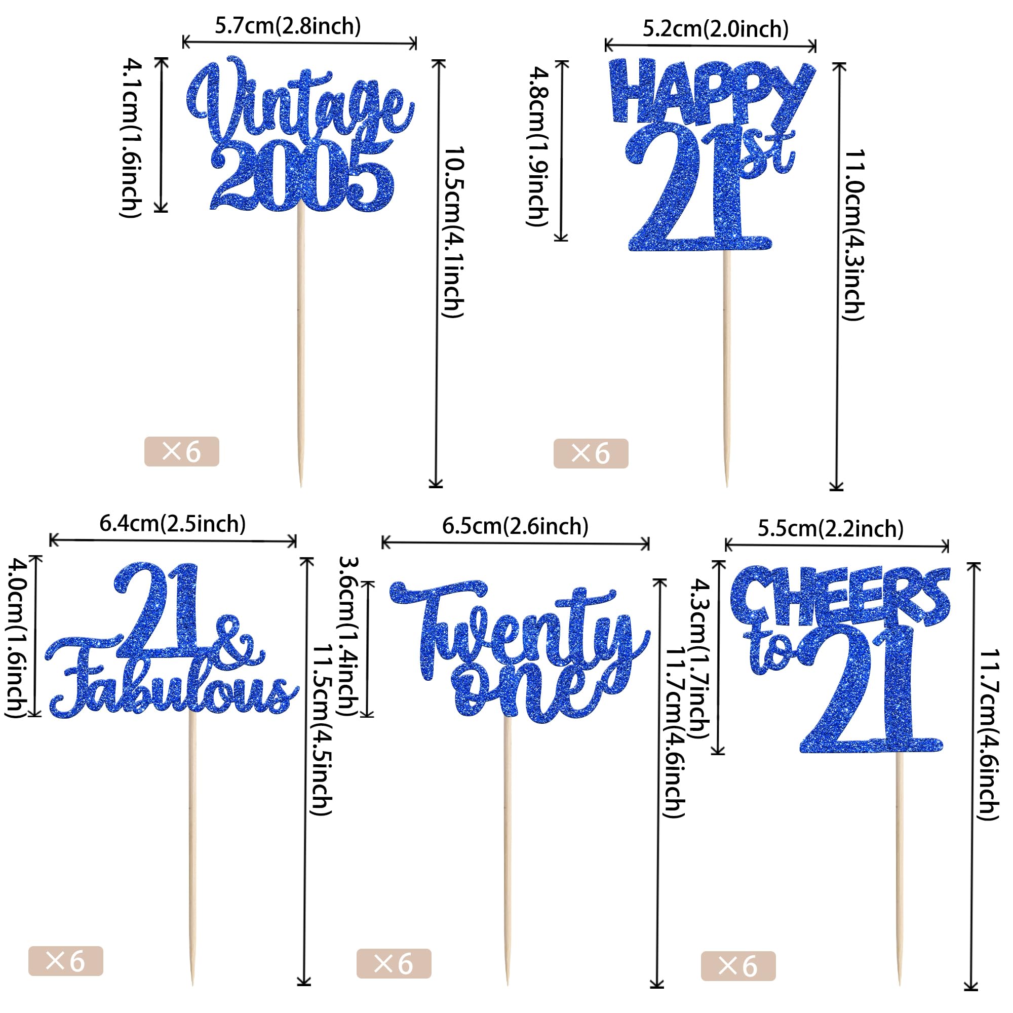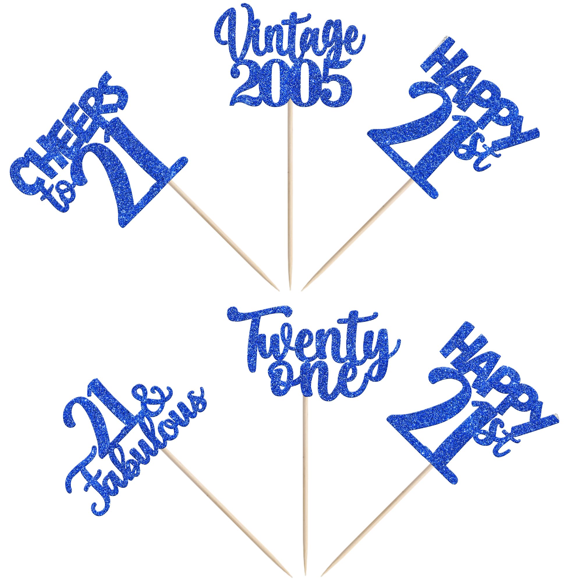Vintage 2005 Happy 21st Birthday Party Cupcake Toppers Decoration Supplies Perfect for vintage 2005 theme party, 21st birthday theme party, 21st wedding anniversary theme party,cheers to 21 years theme party cupcake decorations supplies. Pack of 30 pcs,6 pcs of each design The size is 2.8*4.1/ 2.0*4.3/ 2.5*4.5/ 2.6*4.6/ 2.2*4.6 inch ( with stick ) Made of high qulity paper card stock,thick and thick and sturdy. These vintage 2005 cupcake toppers are single glitter, the back is white, and they are intended for decoration only, please do not put them in oven or microwave. If the item you received has any defects, please contact us immediately.we will deal with it within 24 hours.