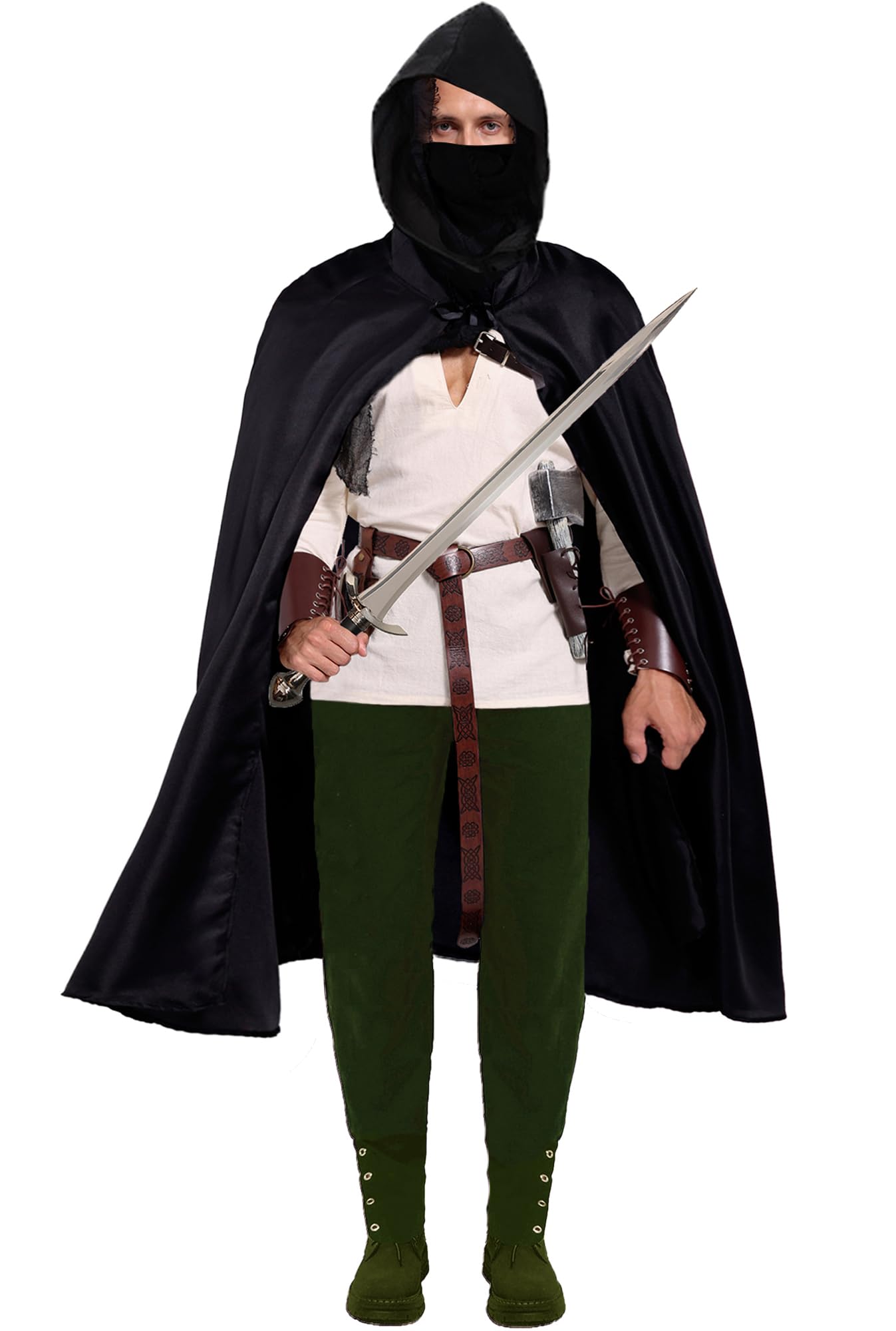 The package include 10 pieces: a pirate shirt, a bare belt trousers, a scarf, a cape, a viking belt, a retro waist bag, 2 buckle wrist guards, a Leather pauldron, a sword holster
