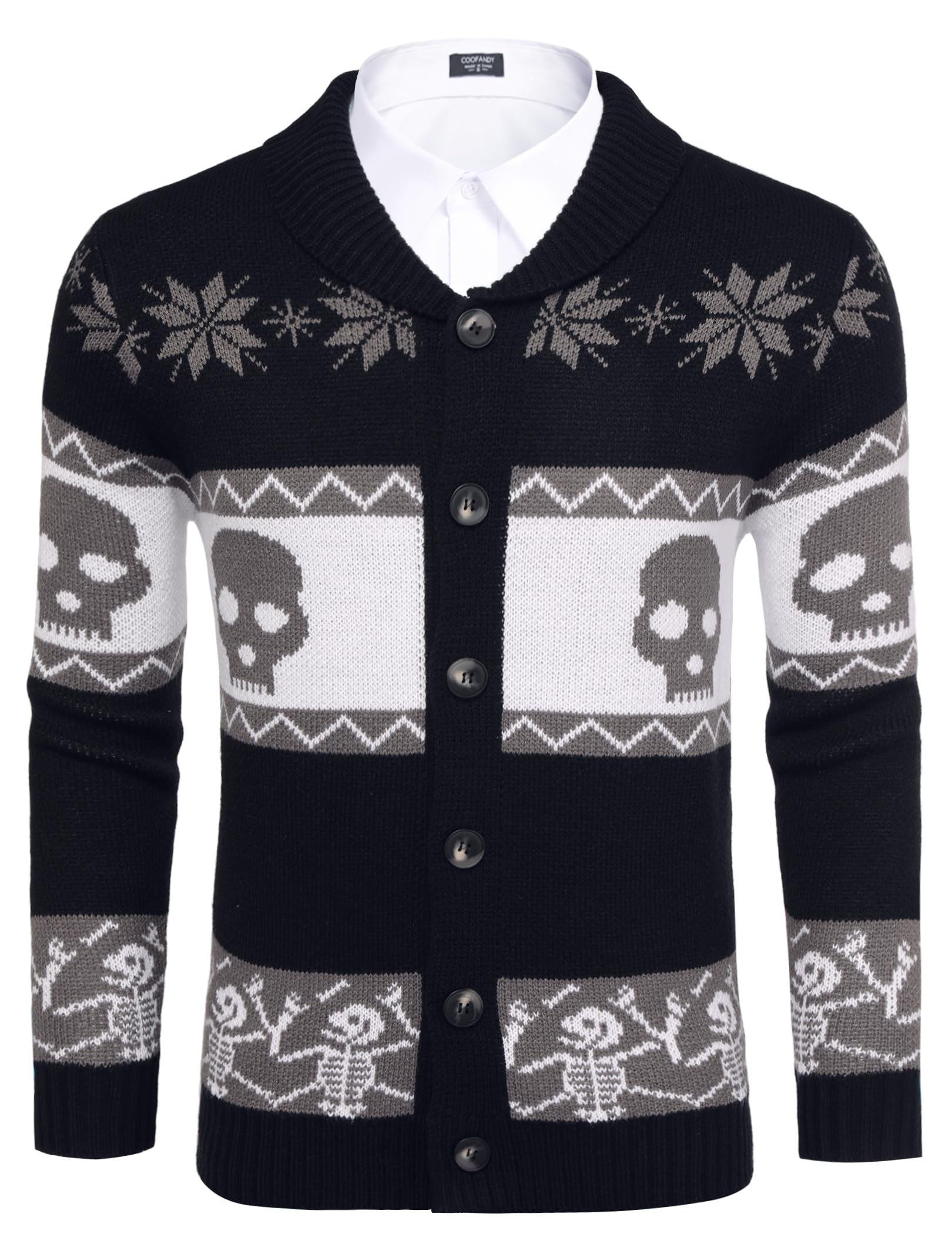 Features: contrast skeleton pattern, button through front closure to help easy wearing or getting off, v neck or open front, long sleeve, ribbed knit, non see through, regular fit