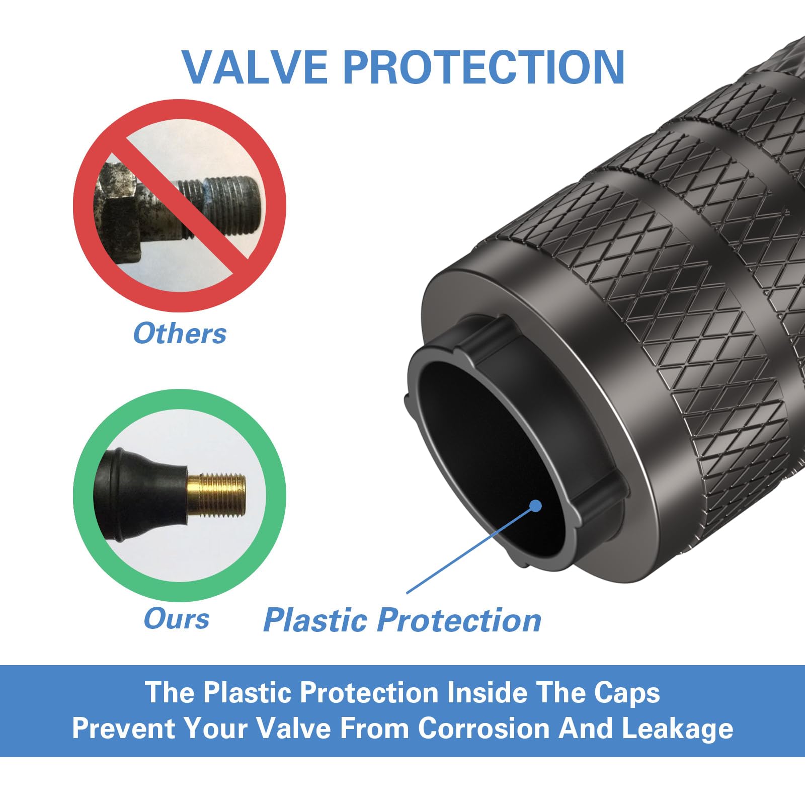 Special Design – Metal materials are prone to rust in the presence of water and oxygen, which may lead to corrosion on valve body. The plastic inner valve caps design combines the attribution of corrosion resistance of plastic and the stylish look of metal.