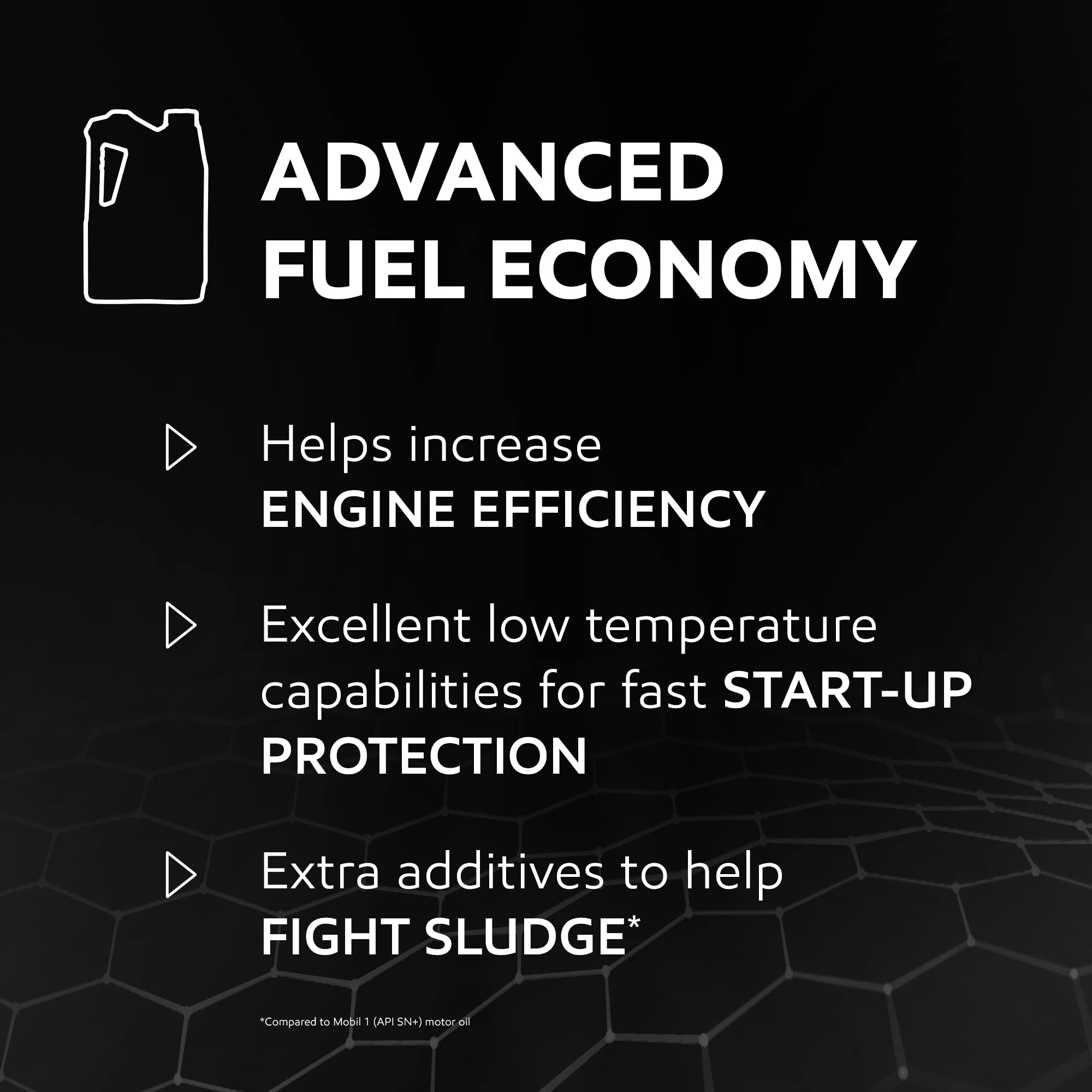 Keep your engine running at peak efficiency while improving fuel economy. Engineered for today’s advanced and hybrid engines, Mobil 1 Advanced Fuel Economy full-synthetic motor oil 0W-30 helps to improve fuel economy* and extend engine life for vehicles of all ages. Mobil 1 Advanced Fuel Economy utilizes Mobil 1’s signature Triple Action Formula to deliver outstanding engine performance, protection, and cleanliness to your vehicle. Specialty components in synthetic oil reduce friction, helping to prevent deposits and sludge buildup to keep critical engine parts clean and protected for up to 10,000 miles between oil changes.** This technologically advanced formulation offers outstanding engine efficiency, wear protection, internal engine heat protection (up to 500 degrees Fahrenheit), and low-temperature protection (to -40 degrees Fahrenheit)—bringing quick cold-weather starting and ultra-fast protection to your engine. Mobil 1 Advanced Fuel Economy meets ILSAC GF-6 standards to help provide low-speed pre-ignition (LSPI) and timing chain wear protection while keeping your engine clean and helping to improve your fuel economy. Mobil 1 Advanced Fuel Economy full-synthetic motor oil 0W-30 also helps control oxidation to prevent oil breakdown and is recommended by ExxonMobil for all types of modern vehicles, including high-performance, turbo-charged, and supercharged gasoline and diesel multi-valve fuel-injected engines found in passenger cars, SUVs, light vans, and light trucks. Mobil 1 is America’s #1 selling synthetic motor oil brand at retail,*** trusted and recommended by car builders and experienced mechanics, and is the Official Motor Oil of NASCAR®. (*Potential fuel economy improvement obtained by switching from higher-viscosity oils to a lower-viscosity grade. Actual savings are dependent upon vehicle/engine type, outside temperature, driving conditions, and your current engine oil viscosity. **Protects for up to 10,000 miles or 1 year, whichever comes first. To learn more about the Mobil 1 Limited Warranty, visit Mobil.US. ***Source: The NPD Group/ Retail Tracking Service/ Dollar Sales/ PCMO full-synthetic/ 52 weeks ending September 30, 2023)