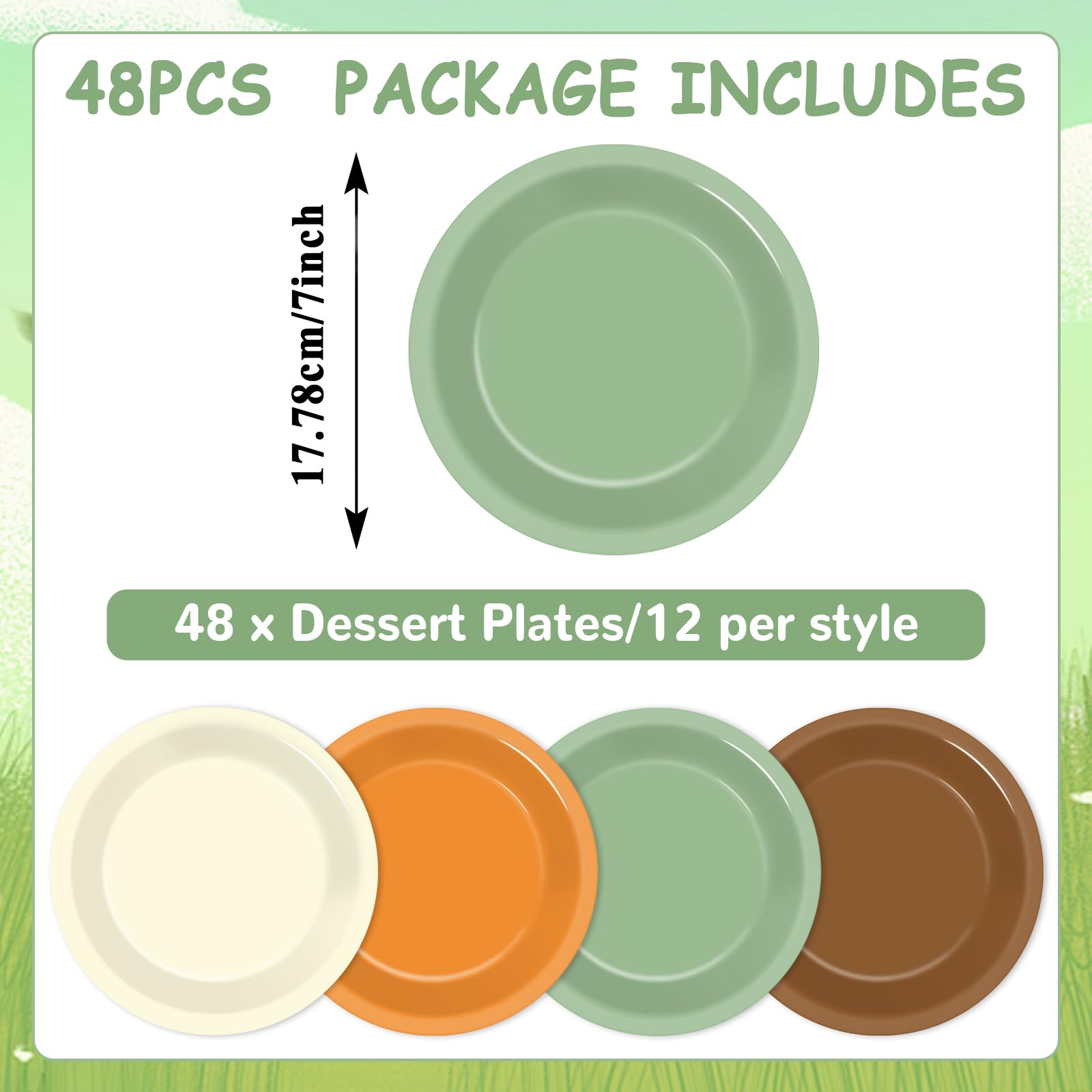 Package includes: The woodland animals tableware set includes a total of 48pcs of 7inch sage green brown plates, with 4 unique colors and 12pcs in each. Our jungle party plates are enough for you to serve 48 guests.