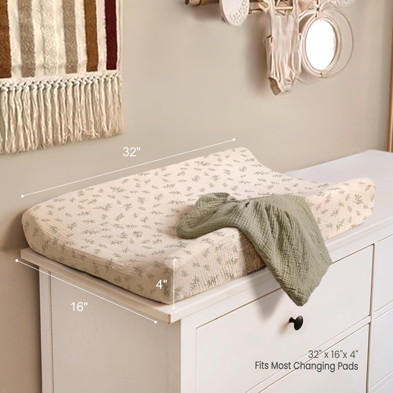 EASY TO INSTALL: The size of the muslin diaper changing pad cover is: 33"x17"x7", which is suitable for the size of most diaper tables, and there are elastic bands around it, which can stably wrap the diaper table. Prevent the cover from slipping when changing diapers, and protect the baby's safety in all directions.