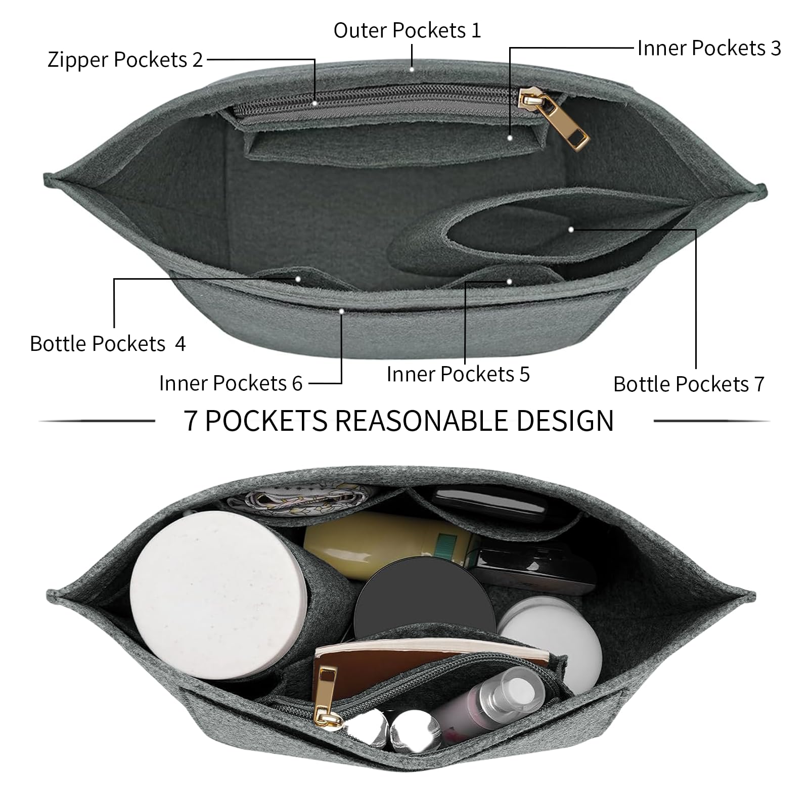 HIGH CAPACITY-MULTI-COMPARTMENTS: Featuring 7 compartments,Two of the pockets, which are exterior pockets, are for storing large items,Five pockets remain, one cup pocket opening and one zippered pocket(Made with high quality metal zipper head for long lasting use)You could store your mobile phone, wallet, cosmetics, glasses and other personal items in purse organizer insert, which is easy to switch bags throughout the day without having to reorganize.