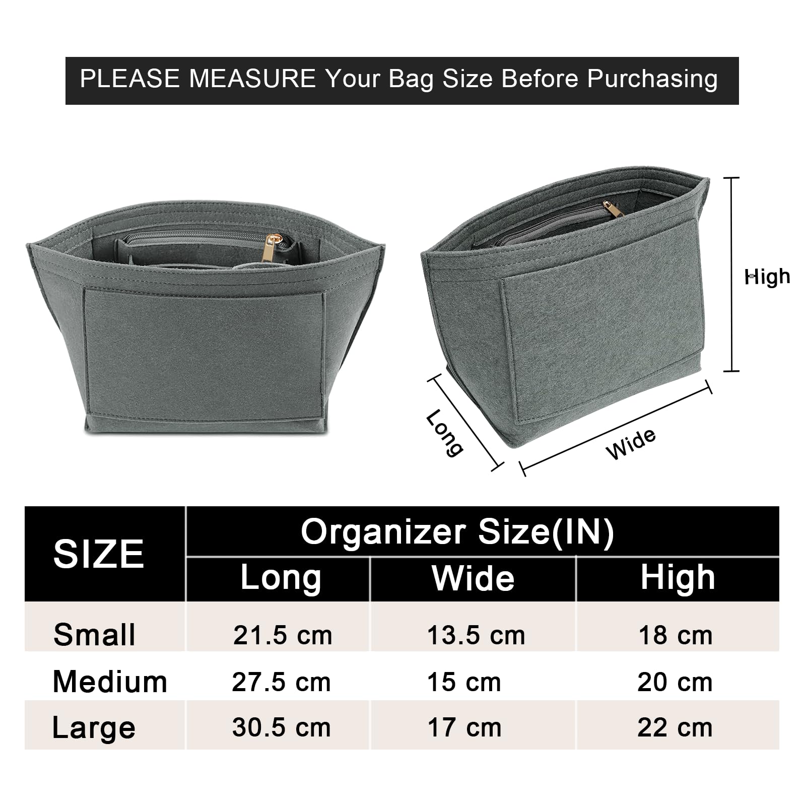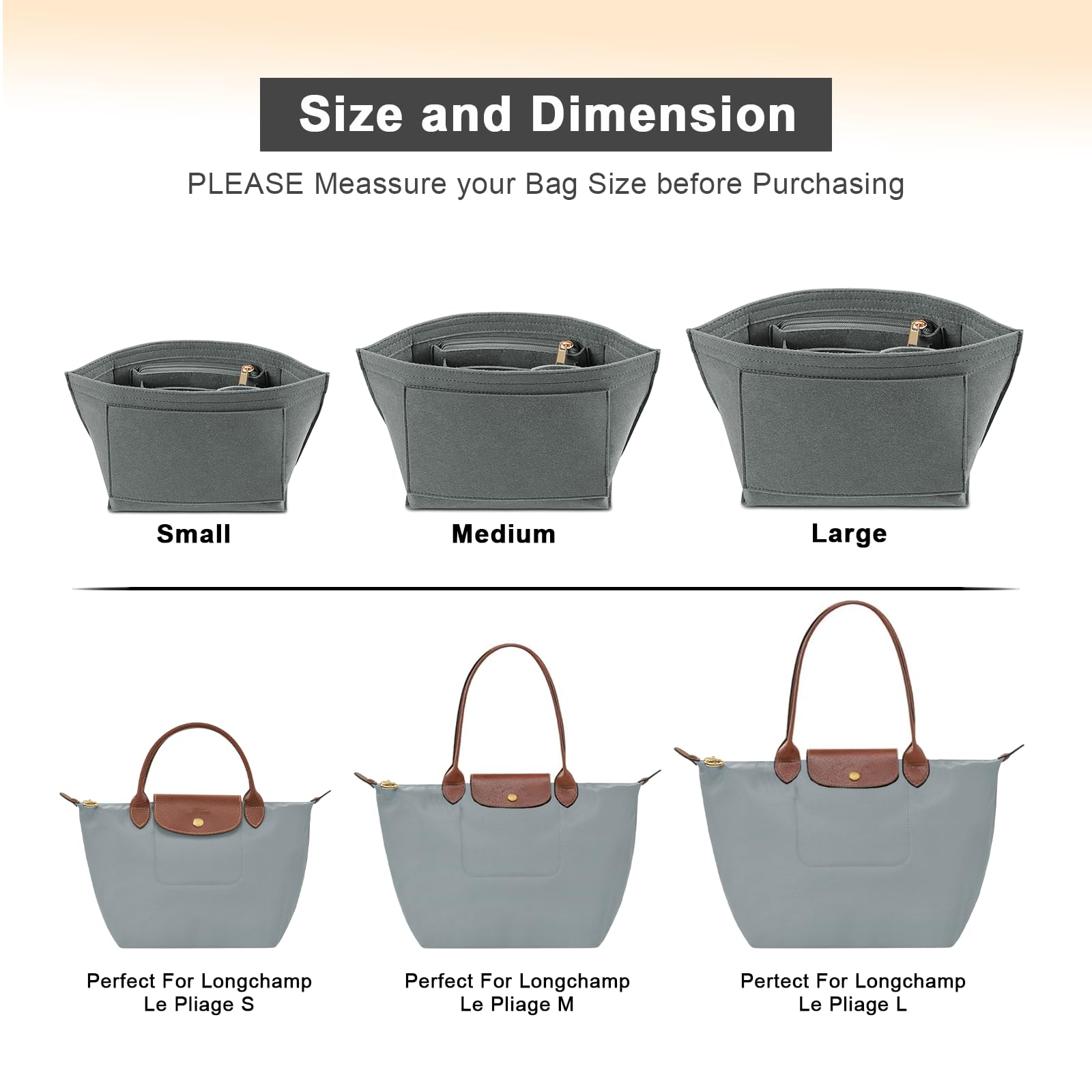 Size of the Felt purse organizer insert - Small: 8.4" (L)*5.3" (W)*7.0" (H) , suitable for Small Size of short handle of Le pliage handbag, or similar size Tote Handbag,It will be more suitable if it is LESS than 0.5-1 inches to ensure a perfect fit,Please comfirm your bag size before purchasing again, thanks.