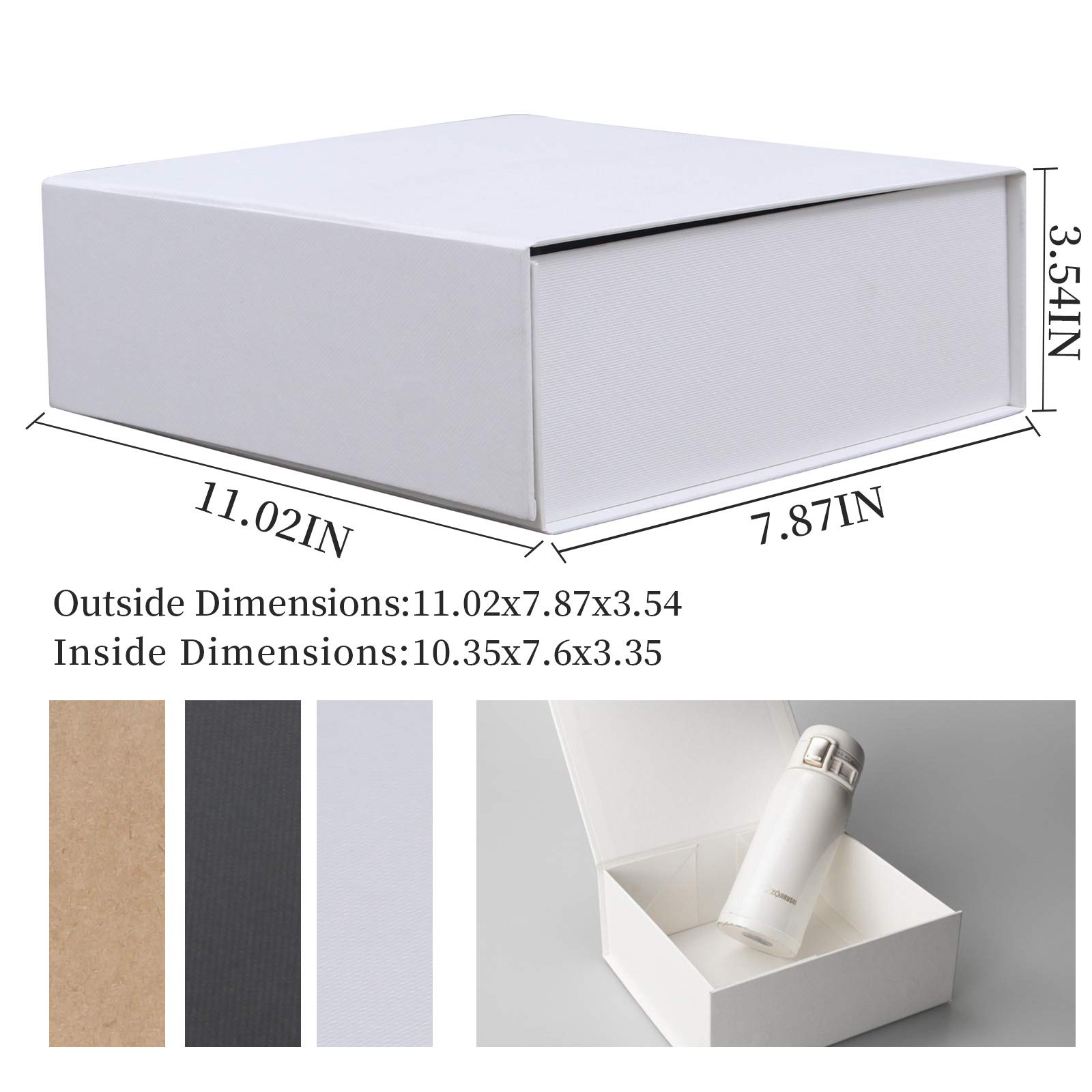 SIZE:The gift boxes are shipped flat assembled boxes outside measure:11*7.8*3.5 inches,Heavy duty book board construction with matte paper over wrap inside and outside.