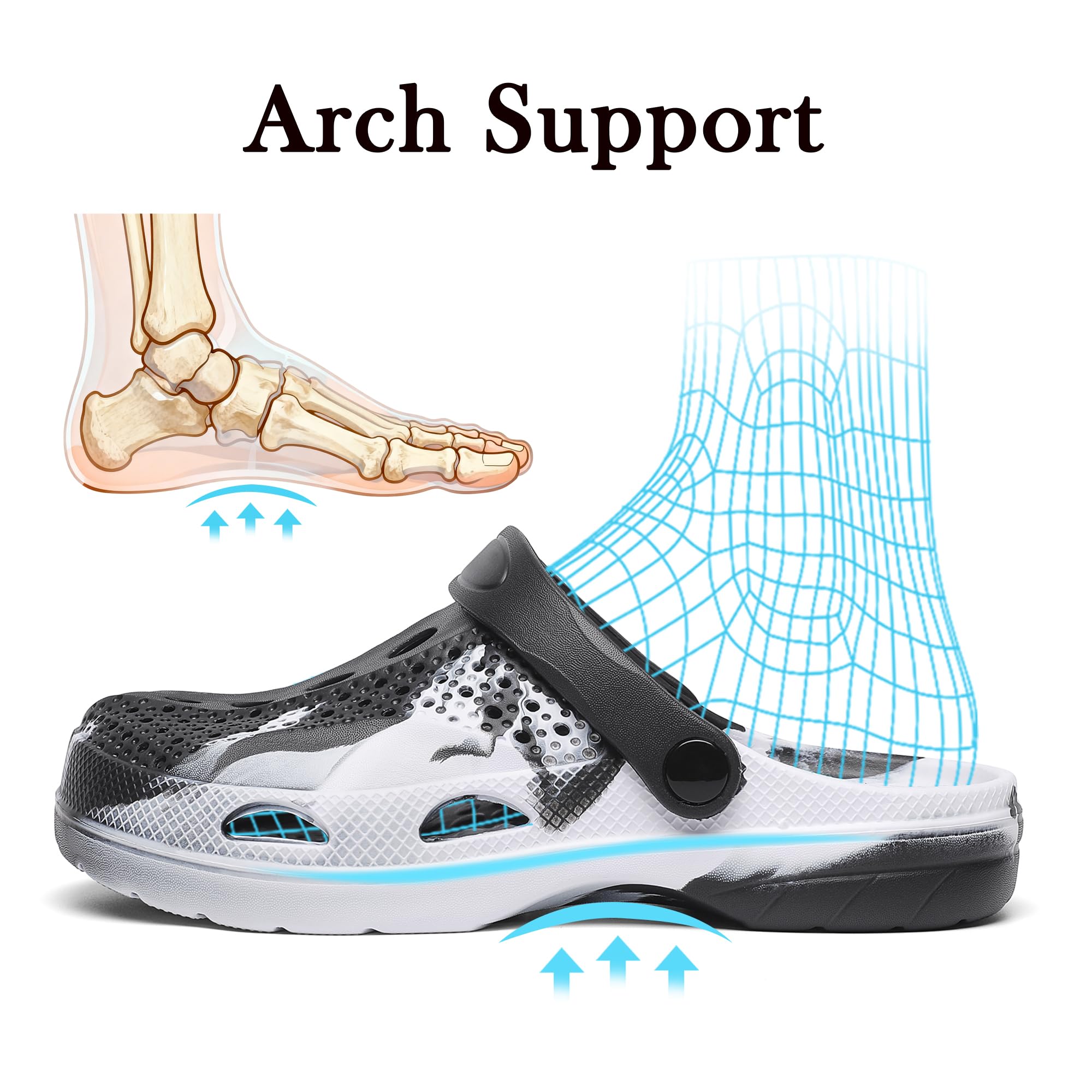 【Great Arch Support 】Womens clogs arch support, these clogs help relieve foot tired provides added stability, helping to absorb shock and reduce stress on your feet. Whether you're gardening, walking at the beach or outdoor activities, these clogs provide the comfort you need