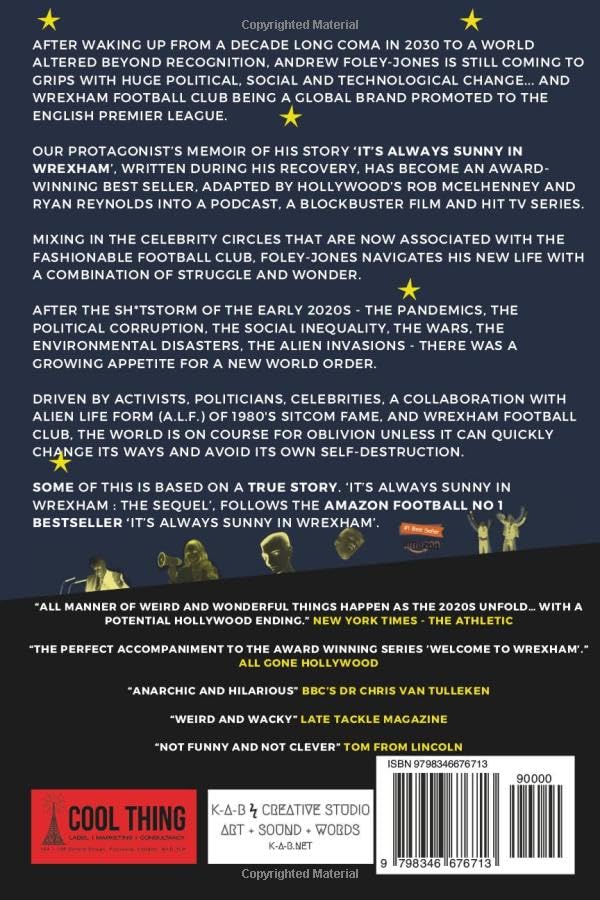 After waking up from a decade long coma in 2030 to a world altered beyond recognition, Andrew Foley-Jones is still coming to grips with huge political, social and technological change... and Wrexham Football Club being a global brand promoted to the English Premier League. Our protagonist’s memoir of his story ‘It’s Always Sunny in Wrexham’, written during his recovery, has become an award- winning best seller, adapted by Hollywood’s rob McElhenney and Ryan Reynolds into a podcast, a blockbuster film and hit tv series. Mixing in the celebrity circles that are now associated with the fashionable football club, Foley-Jones navigates his new life with a combination of struggle and wonder. After the sh*tstorm of the early 2020s - the pandemics, the political corruption, the social inequality, the wars, the environmental disasters, the alien invasions - there was a growing appetite for a new world order. Driven by activists, politicians, celebrities, a collaboration with alien life form (A.L.F.) of 1980's sitcom fame, and Wrexham football club, the world is on course for oblivion unless it can quickly change its ways and avoid its own self-destruction. Some of this is based on a true story. ‘it’s always sunny in Wrexham : the sequel’, follows the amazon football no 1 bestseller ‘It’s Always Sunny in Wrexham’. “All manner of weird and wonderful things happen as the 2020s unfold… with a potential Hollywood ending.” New York Times - The Athletic “The perfect accompaniment to the award winning series ’Welcome to Wrexham’.” all gone Hollywood “Anarchic and hilarious” BBC’s Dr Chris van Tulleken “Weird and wacky” Late Tackle Magazine “Not funny and not clever” Tom from Lincoln