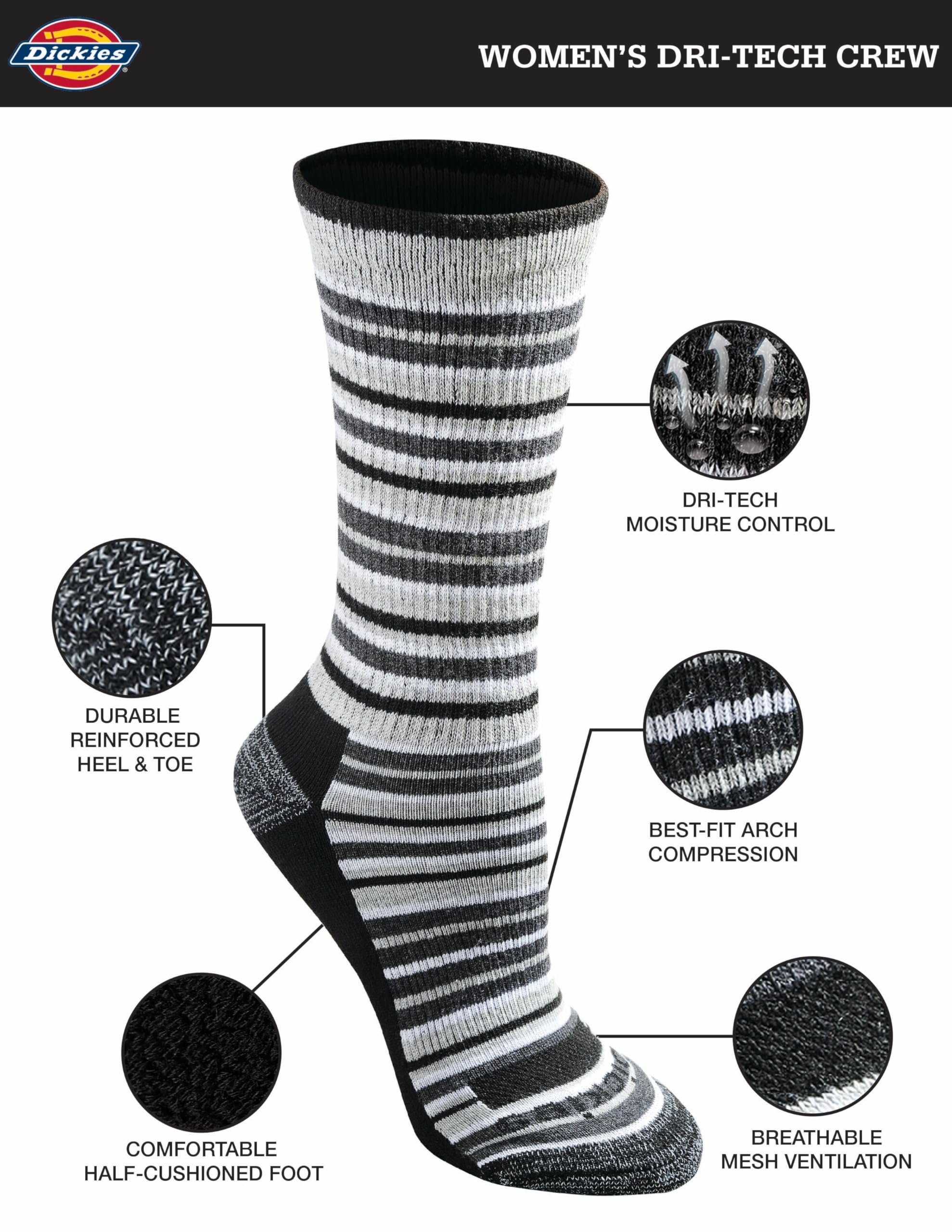 Description Dickies dri-tech moisture control for women's crew socks combines moisture wicking fibers and mesh ventilation channels to keep feet dry and comfortable. Since 1922 Dickies has been making hard-duty work products built to stand up to whatever life throws at you. Dickies Work Socks are built with purpose to deliver superior comfort and performance on and off the job. Dri-tech Moisture Control Sock Collection features: Moisture Management to help keep your feet cool, dry, and comfortable throughout the day.