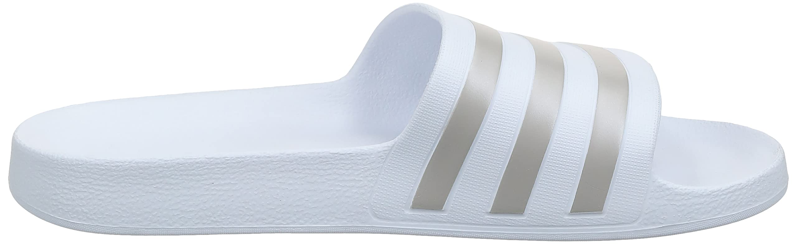 Description These Adilette Aqua Slides bring welcome comfort to tired feet. They have a one-piece molded EVA upper and a plush Cloudfoam footbed. Hit the shower in adidas 3-Stripes.