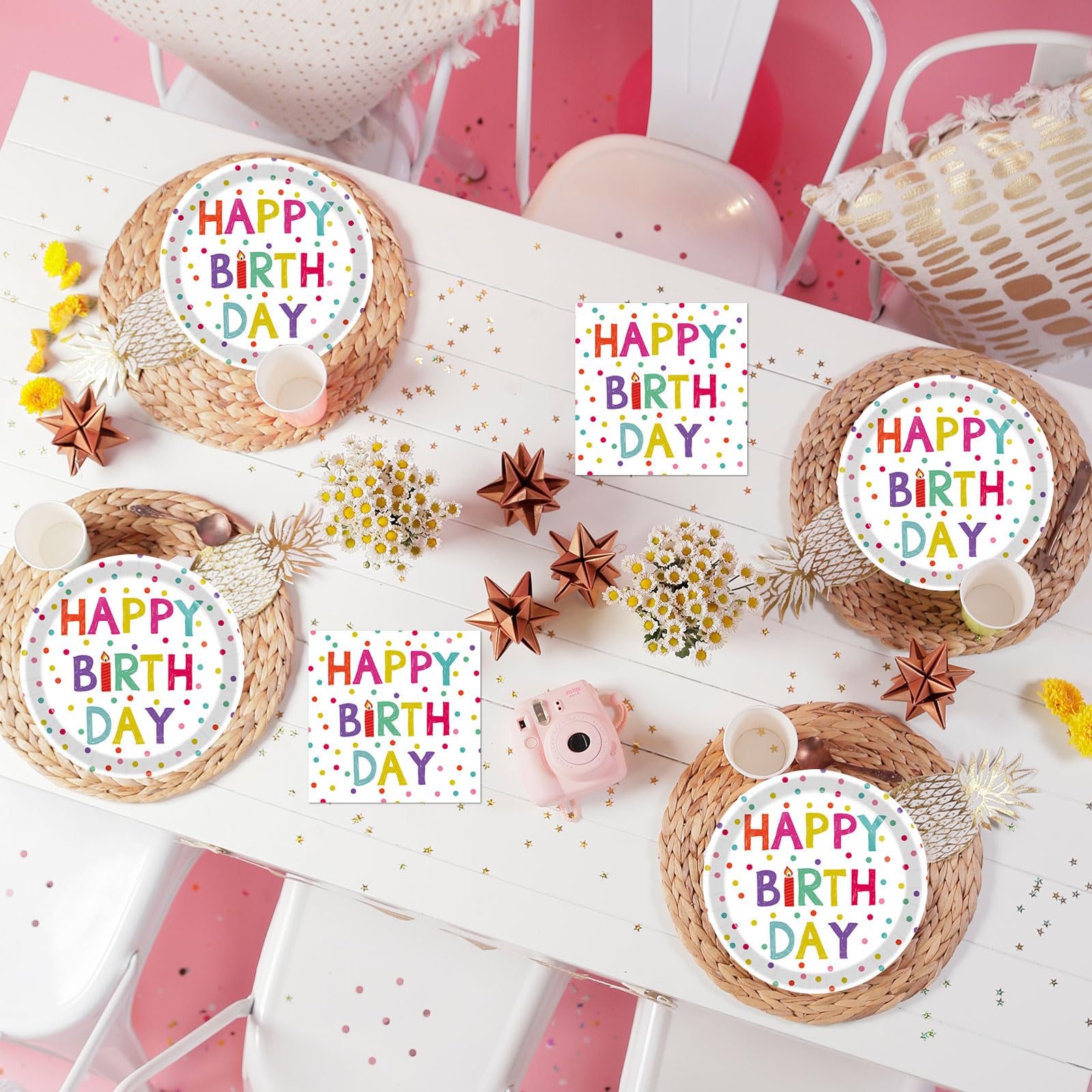 🎂Elegant Design: Our party supplies feature a stunning white background decorative design with colorful dots, candles, and happy birthday patterns, adding a touch of elegance to your celebration.