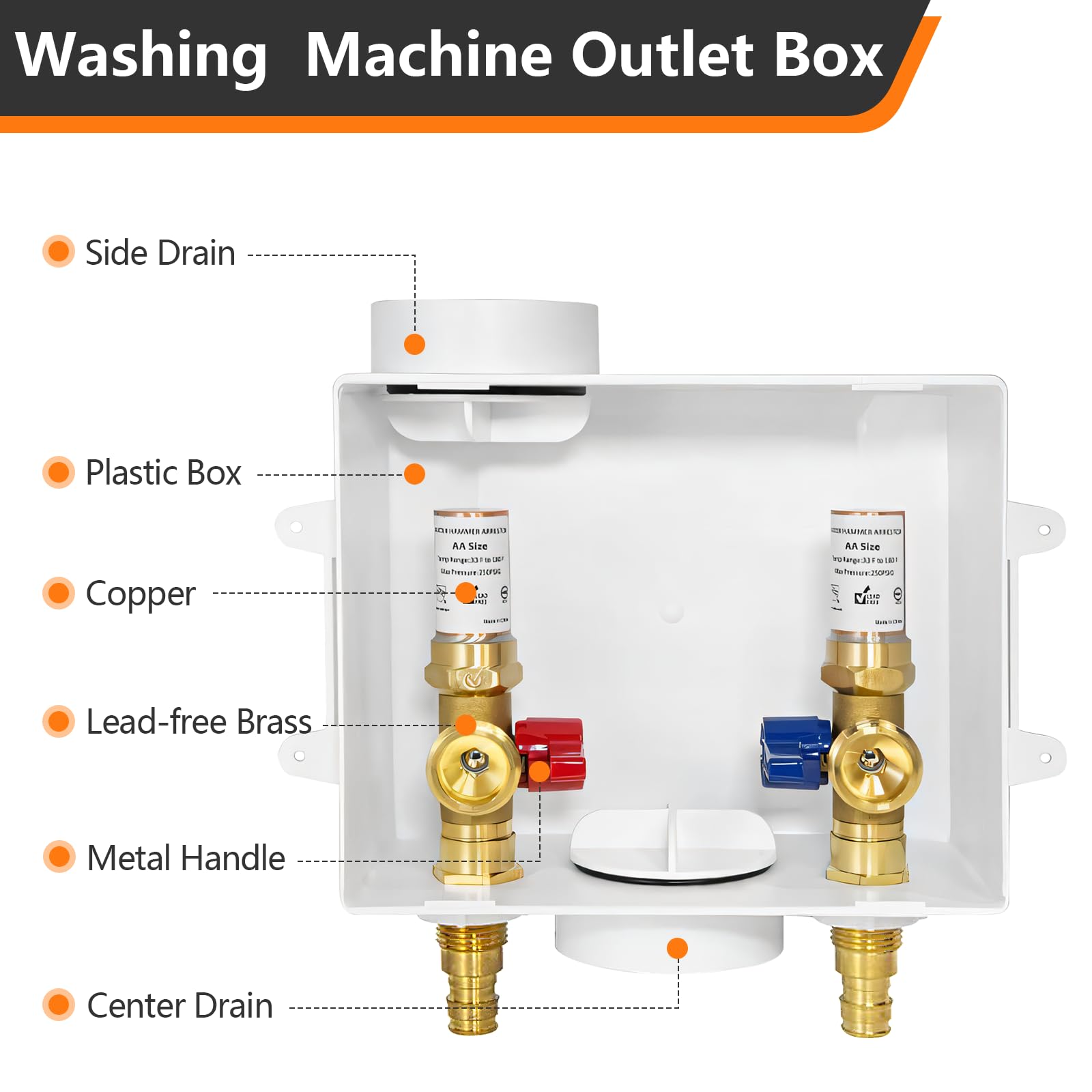 PACKAGE INCLUDE:1.washing machine outlet box,Equipped with a copper arrestor. 2.pre-installed support brackets 3.protective box cover.