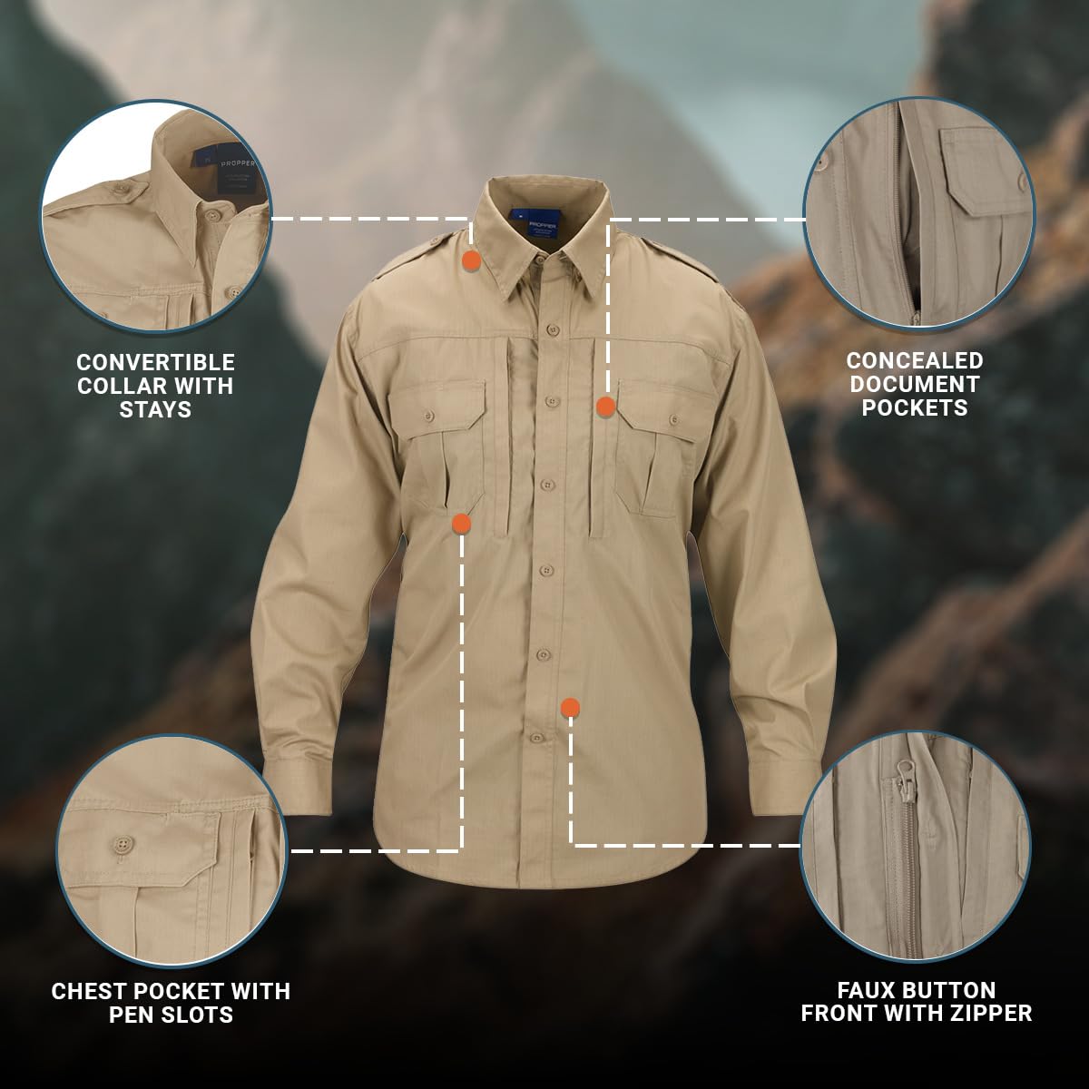 SMART DESIGN: The Propper Long Sleeve Tactical Shirt is made with 65% polyester 35% cotton lightweight ripstop and has a clever concealed zipper front closure hidden behind a traditional button placket façade