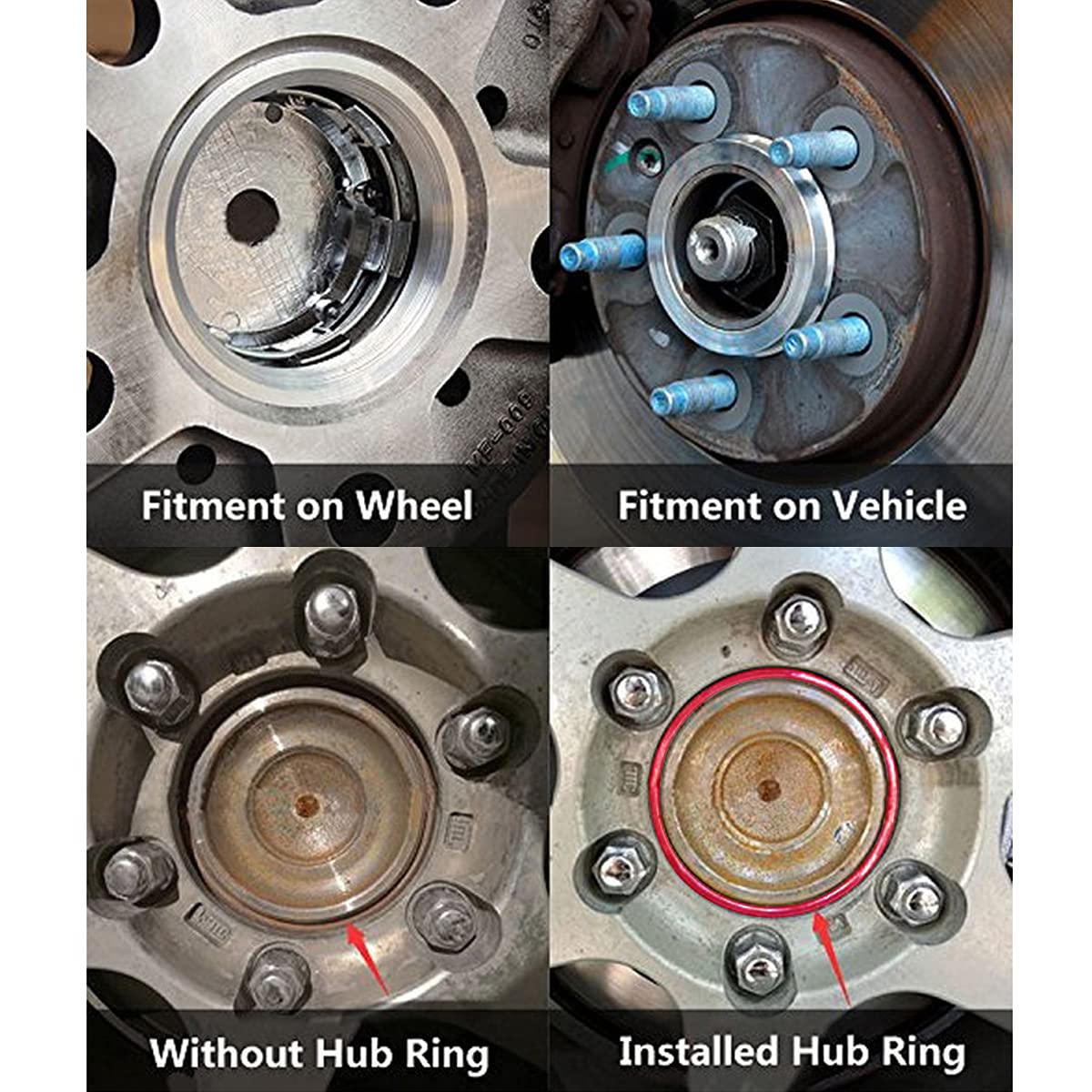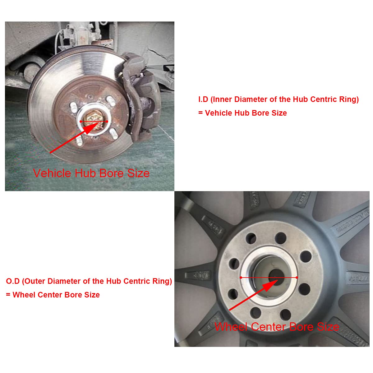 Why we need hub centric ring Hub centric rings is designed to correct the difference /gap between your wheel bore and your vehicle's hub lip. Hub centric rings is inserted between the vehicle hub and the wheel center bore. It fills the gap in between. This allows the wheel bore to engage fully with the vehicle hub with the help of hub centric rings. Thus any vibrations caused by the gap is eliminated. Our Hub Centric Ring Features Made of High Quality Alloy Aluminum 6061, T6 heat treatment. Red anodic oxidation, nice looking, corrosion resistant, heat resistant and durable. Does not bend easily, offering a tighter fit. Quick and easy installation in minutes. How to choose the correct hub centric ring Buyer is responsible for ordering the correct size. It is necessary that you measure your vehicle hub bore size and your wheel center bore before purchasing. If you are not 100% sure of your vehicle hub size, send us email and we will be happy to look it up for you. Just provide the Year, Make, Model of your vehicle.