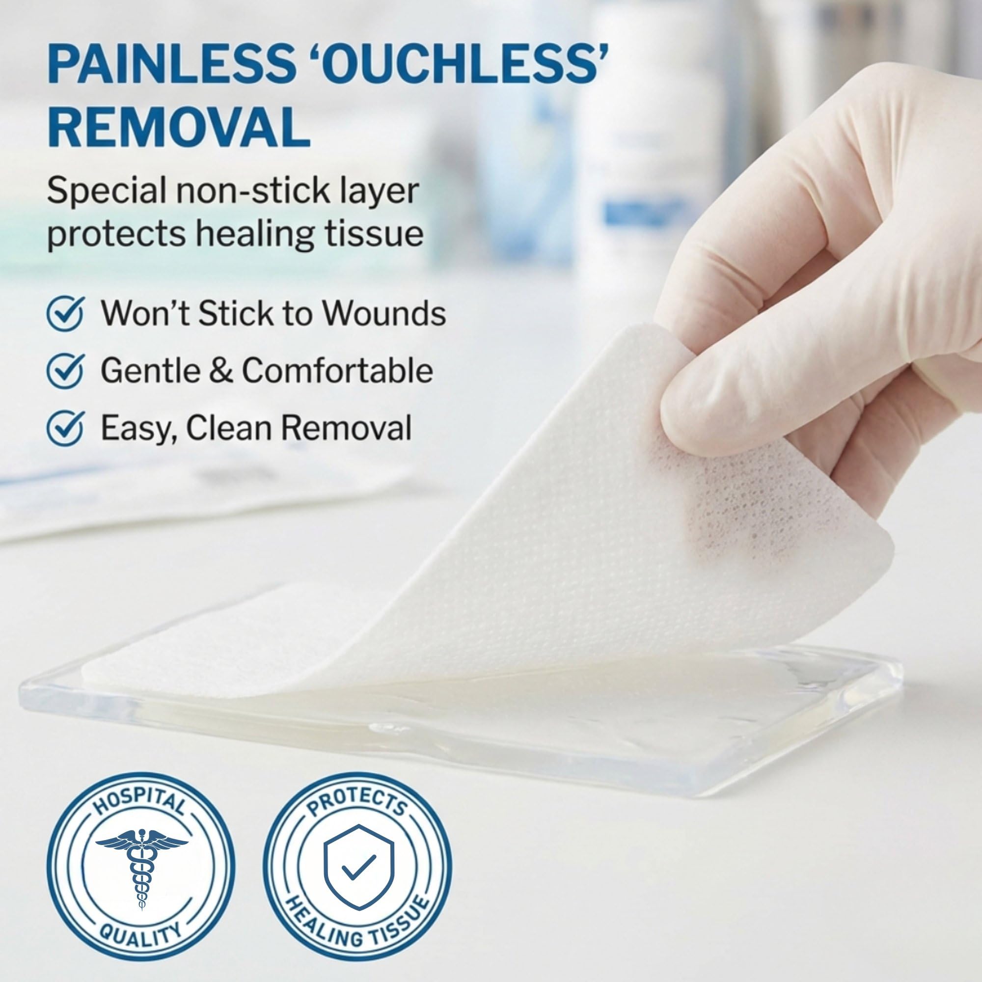 PAIN-FREE REMOVAL: Non-adherent, micro-perforated film won't stick to wounds. Painless dressing changes for sensitive skin, post-surgery, burns, and long-term wound care
