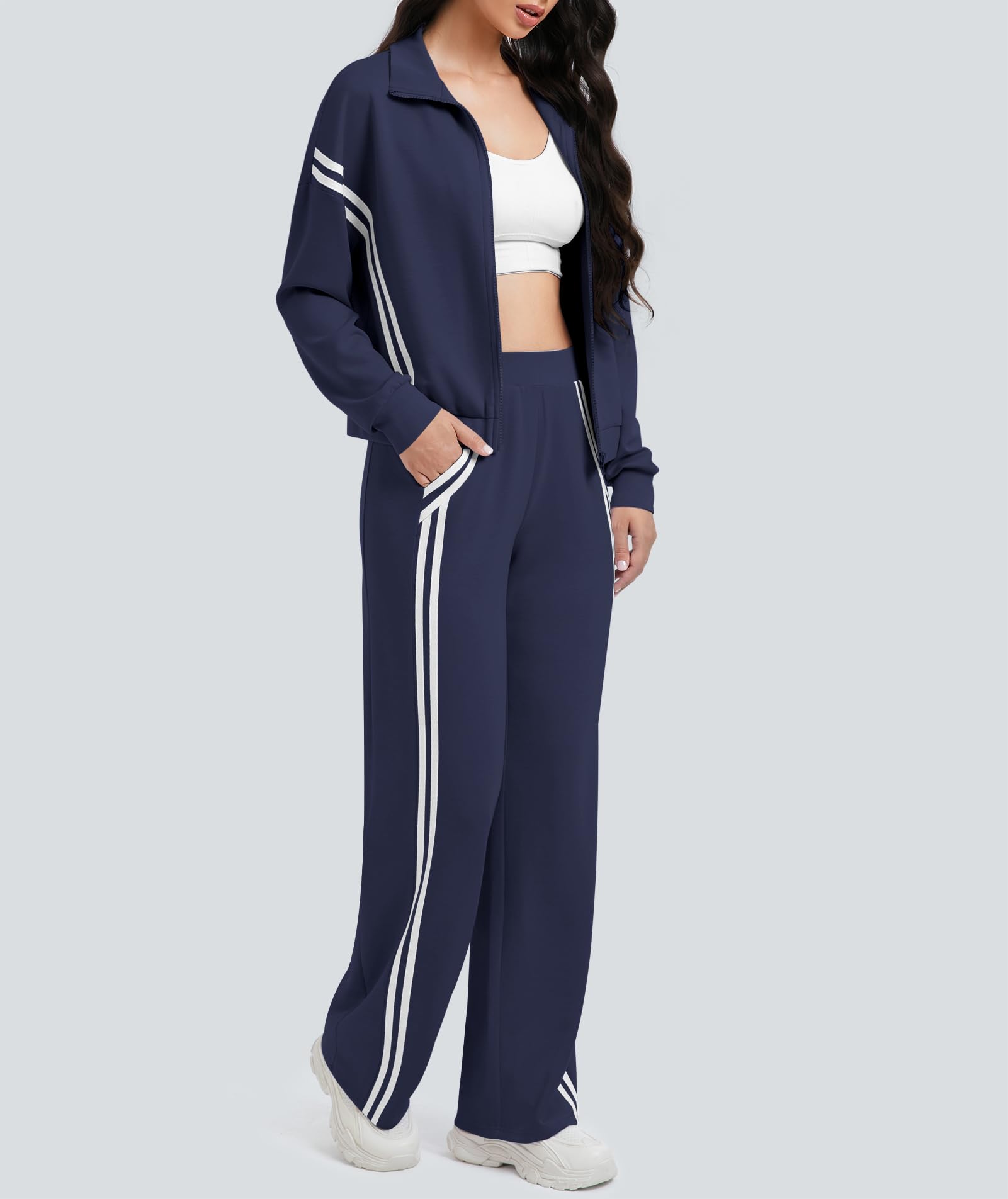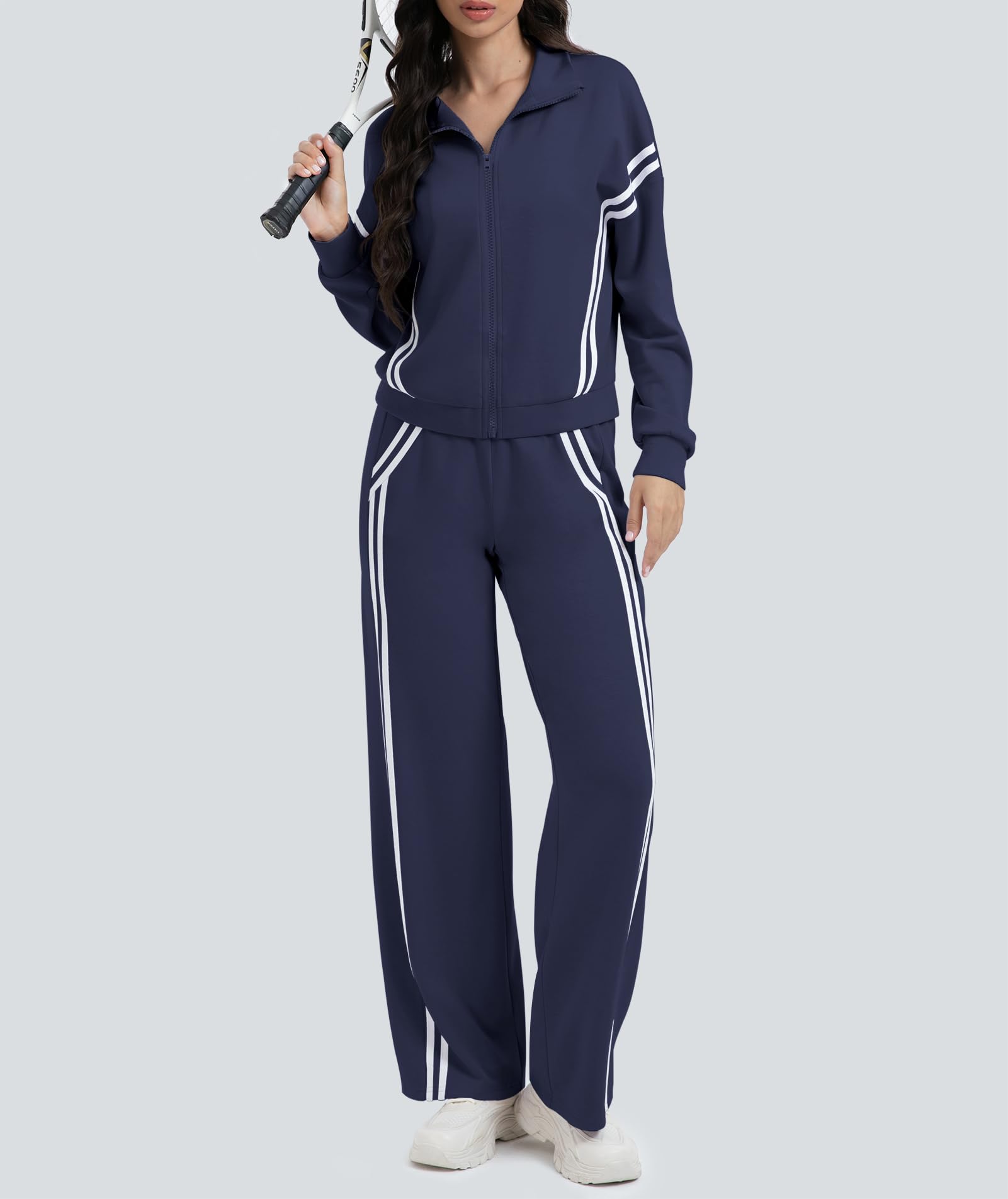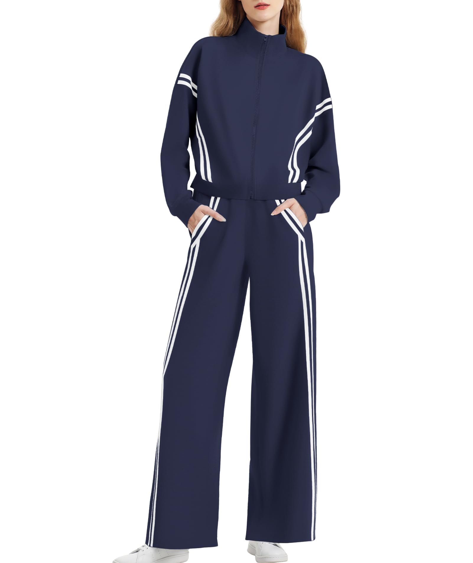 Design: The 2 piece sets for women features contrasting side stripes for a slimming, elongated silhouette. The zip-front jacket and wide-leg pants are flattering all body types. 2 Piece Outfits For Women/Tracksuit Sets For Women/Lounge Sets For Women