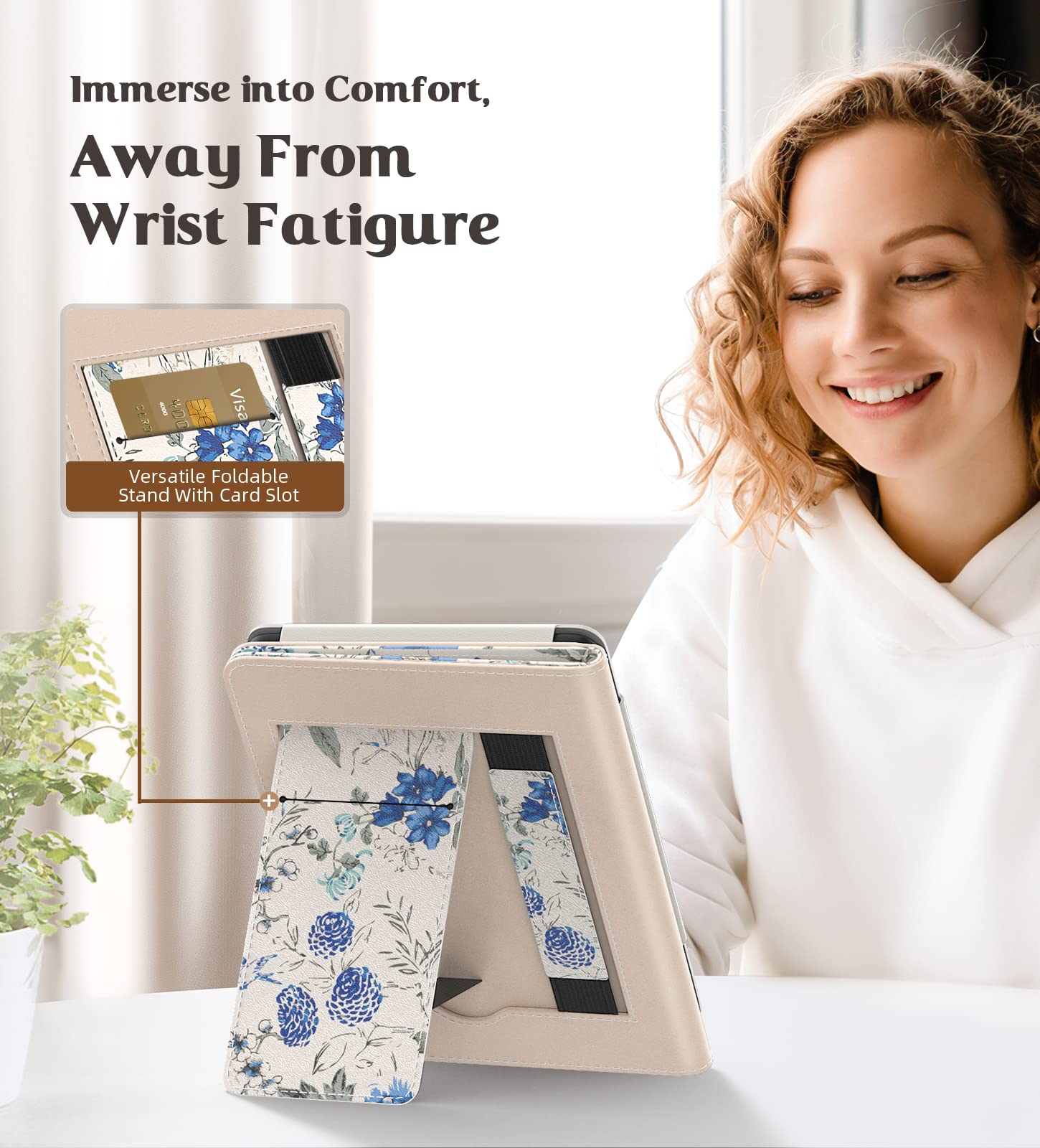 Making Reading Easier: Stand design makes reading more convenient, Build-in card slot can store your cards and cashes