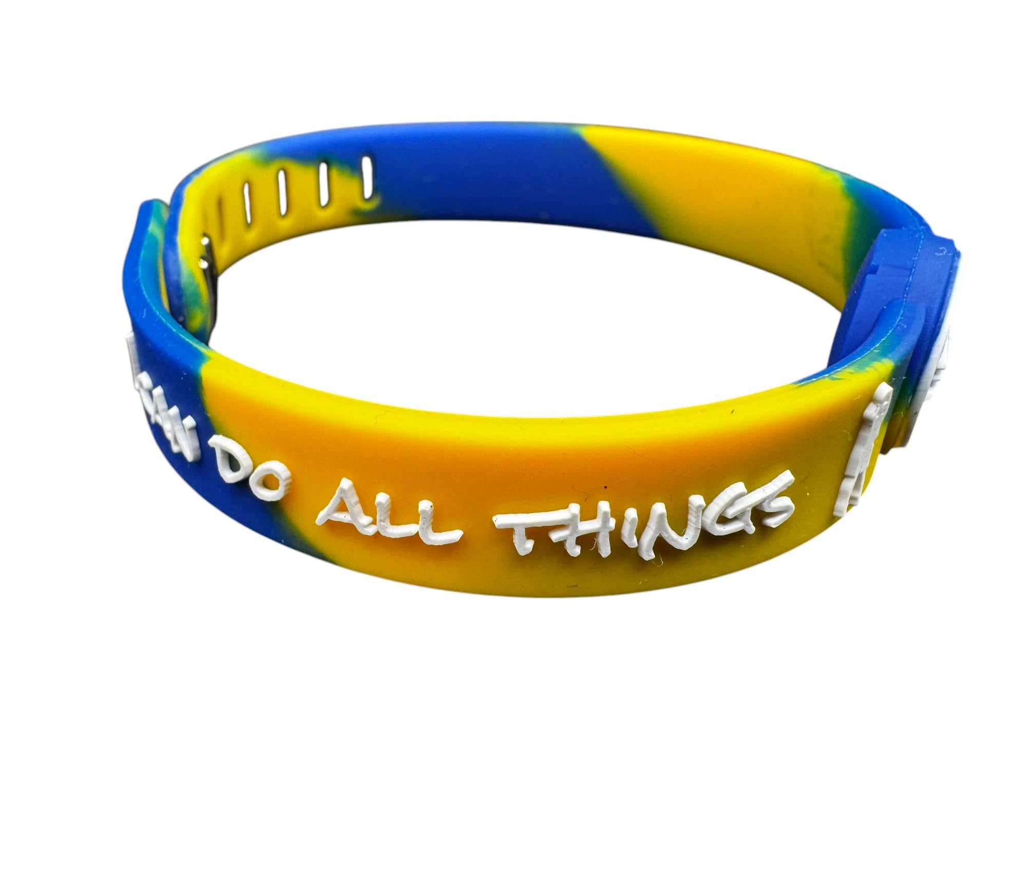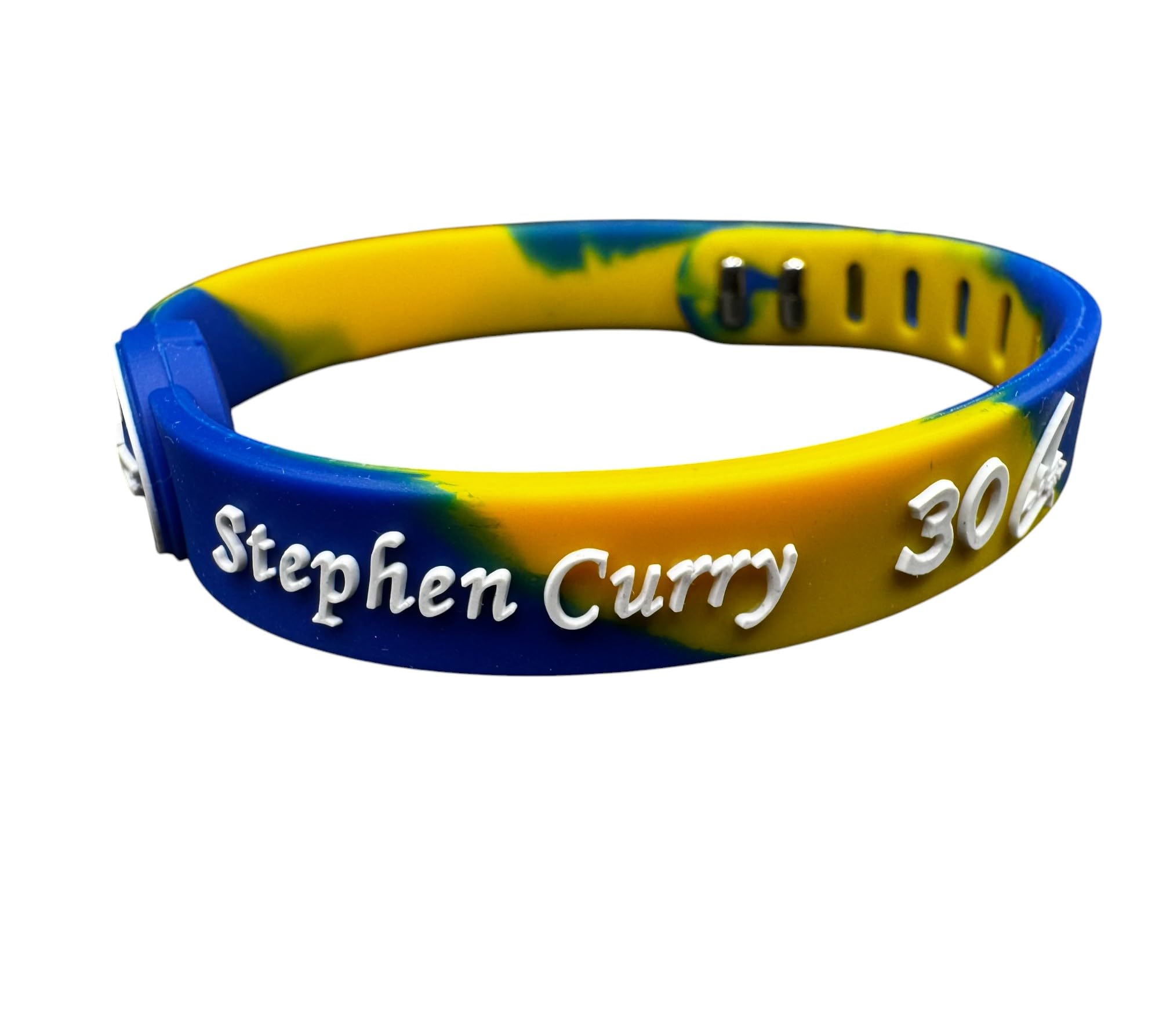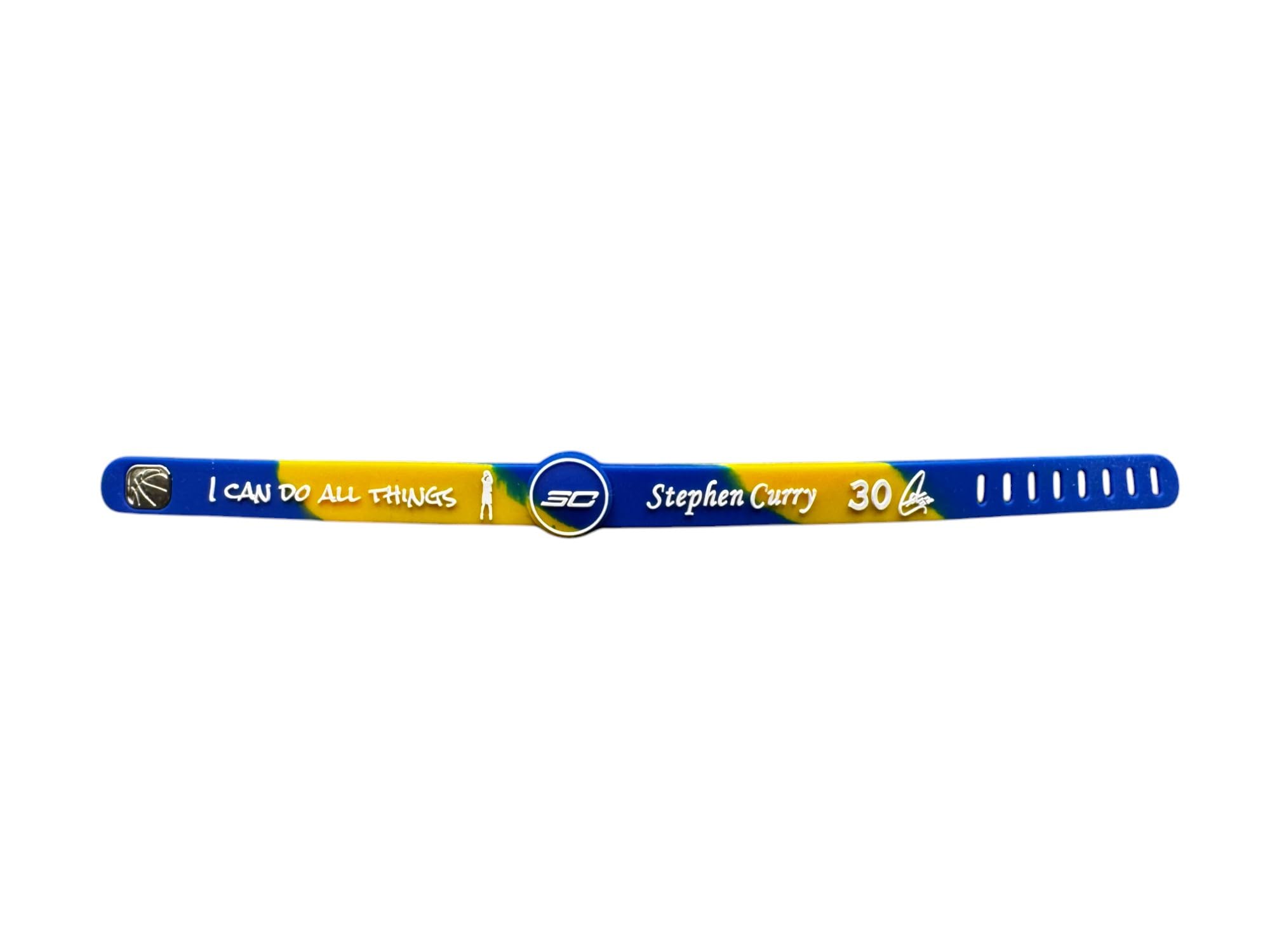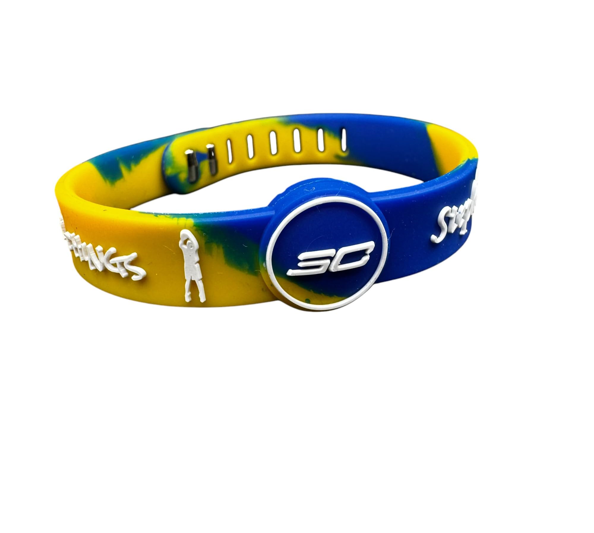 SPLASH BROTHER ENERGY — yellow-blue wristband honors Stephen Curry rainbow threes, mouth-guard grin, shimmy dance, half-court heaves, tunnel pregame vibes; irresistible collectible for GSW diehards, gift shoppers, content makers