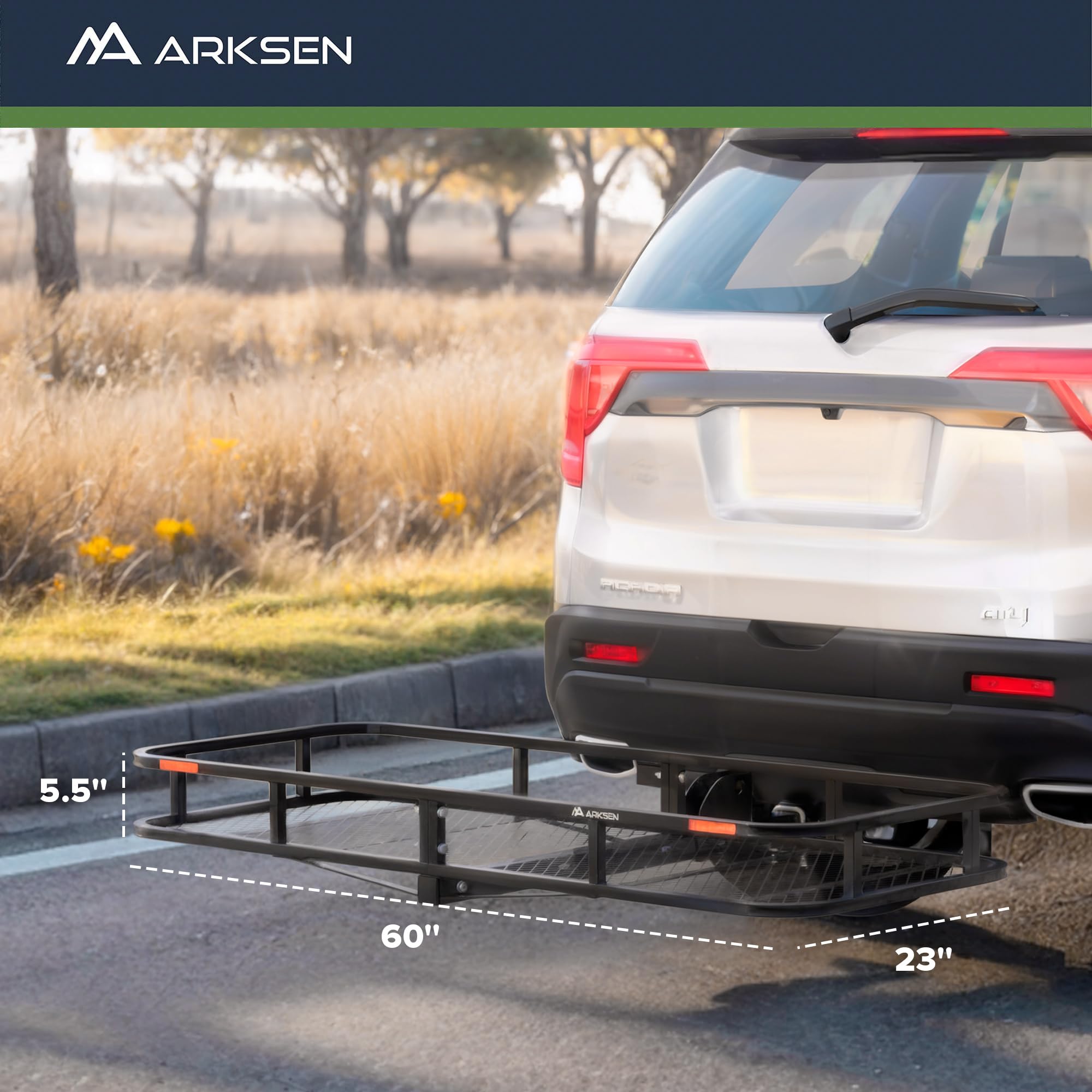 500 LBS Heavy-Duty Capacity: The ARKSEN hitch cargo carrier is engineered to support up to 500 lbs of cargo. Constructed with reinforced square steel tubing and a durable steel mesh base, it provides exceptional strength while preventing smaller items from falling through. The carrier is finished with a high-strength black epoxy powder coating that resists rust, corrosion, rain, and road salt for long-lasting outdoor durability.