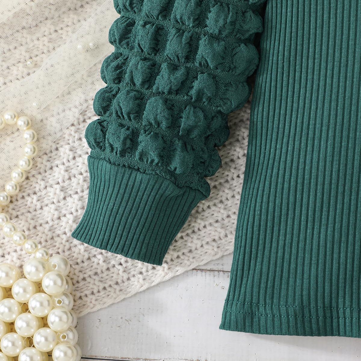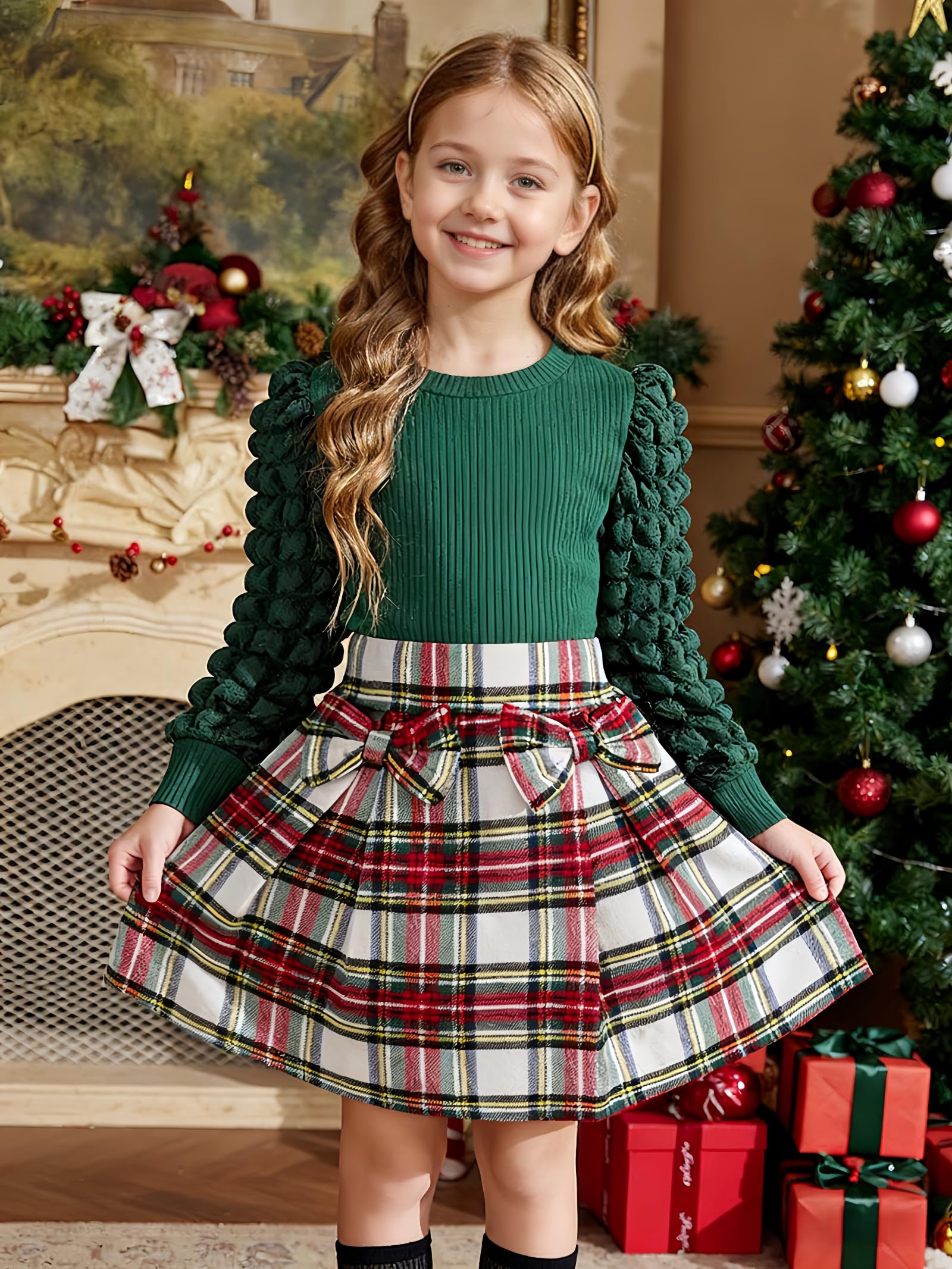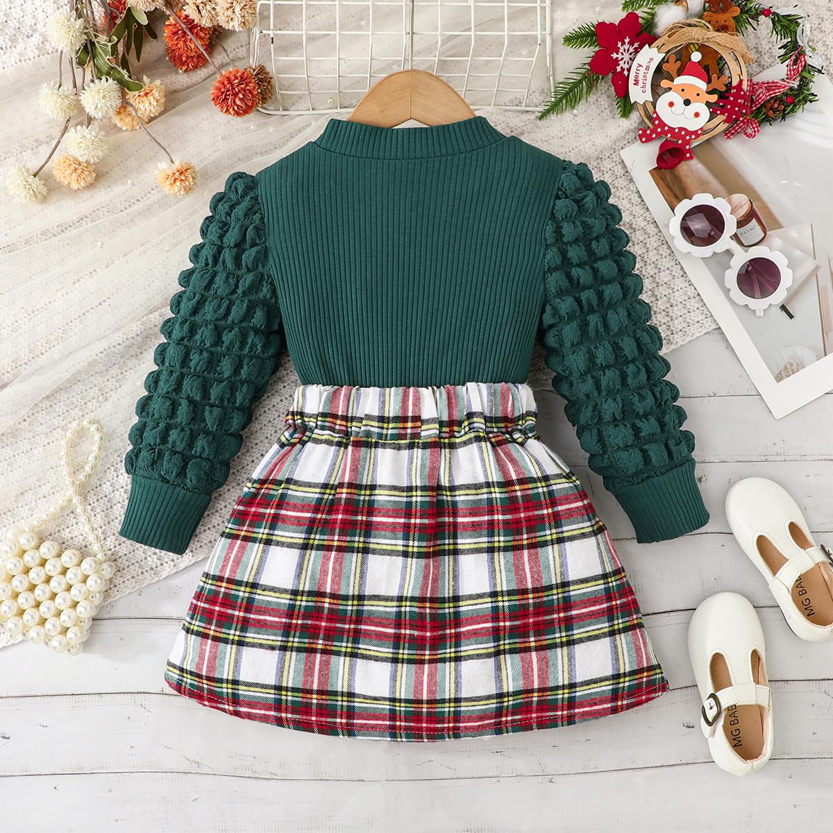 Feature: Christmas outfits for girls,cute lantern puff sleeve,classic green plaid Skirt,comfy ribbed shirt and tweed plaid skirt set, girls plaid skirt with delicate bowknot decoration,lovely and stylish,green plaid outfits are suitable for your little princess in autumn winter and Christmas wear.