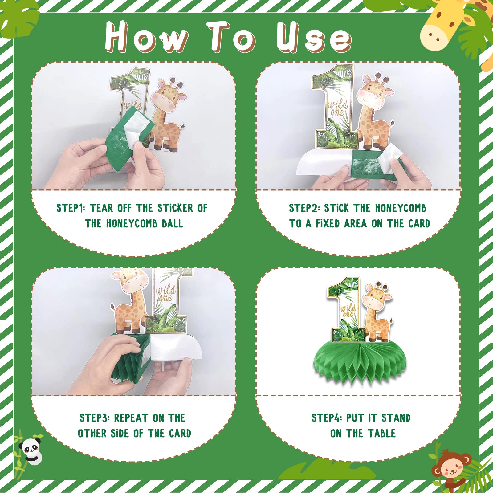 Easy to assemble: Safari baby shower decorations for boy are very easy to install, you just need to tear off the sticker in the center of the honeycomb, stick the sticker on the fixed area of the card, and repeat this on the other side. The finished safari baby shower centerpieces can be placed anywhere you want.