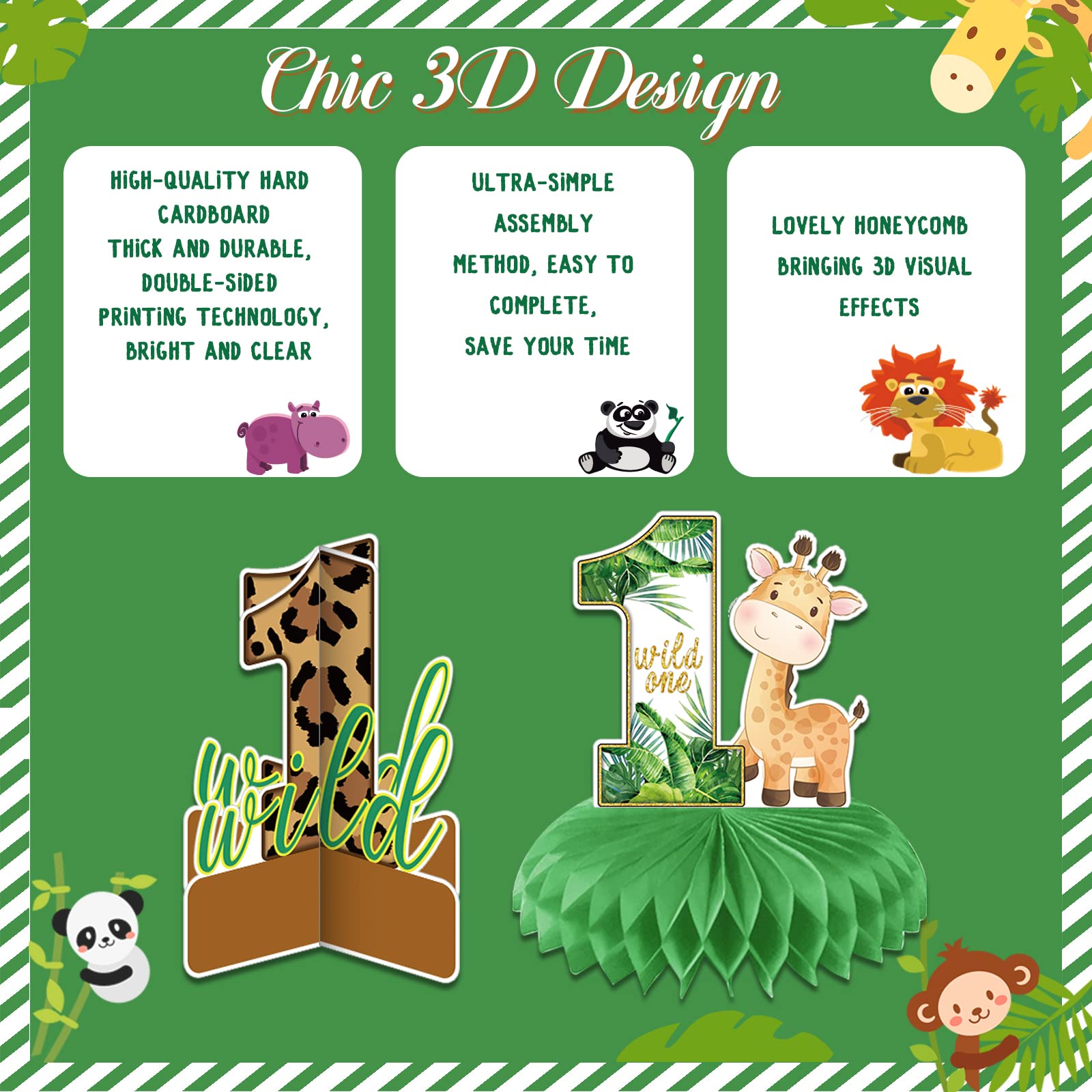 Package includes: Wild one birthday decorations for boys include 10 different styles of wild one birthday decorations for boys honeycomb centerpieces and 4 standing cardboard decorations The cute animal design and the right size can meet your jungle party needs and make it more attractive.