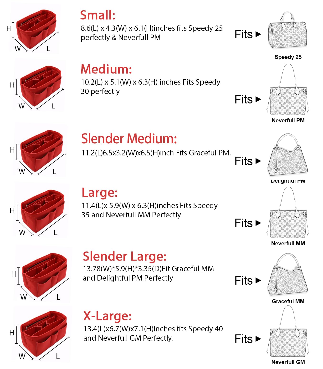 Small:8.6(L) x 4.3(W) x 6.1(H)inches fits LV Speedy 25 perfectly & LV Neverful PM ; Medium: 10.2(L) x 5.1(W) x 6.3(H) inches Fits Speedy 30 perfectly; Large: 11.4(L)x 5.9(W) x 6.3(H)inches Fits LV Speedy 35 and LV Neverful MM Perfectly.X-Large:13.4(L) x6.7(W)x7.1(H)inches fits LV Speedy 40 and LV Neverful GM Perfectly.Portable and Compact Purse Perfectly For any Brand, Such As LV, Longchamp Le Pliage Tote, MK, LV Petit Noe, Gucci, etc.
