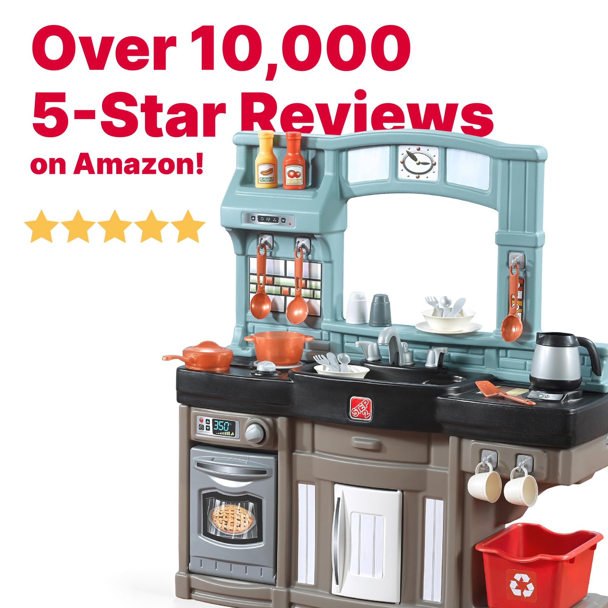EASY STORAGE: When playtime fun is done, multiple accessory hooks and shelves along with the recycling bin help store the 25 included play kitchen accessories to keep this playset looking neat and tidy.