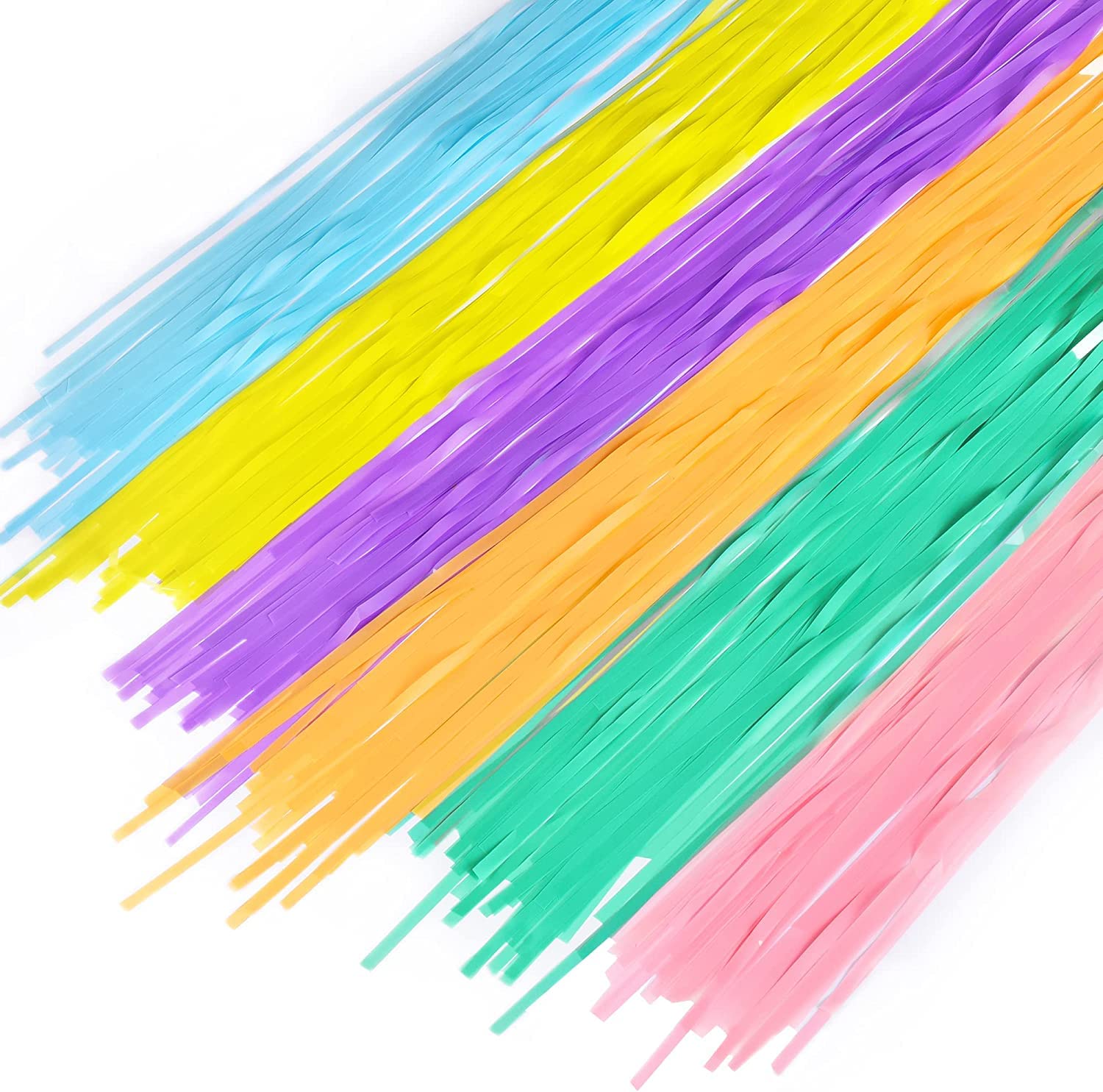 Total 6.4 ft x 8.2 ft foil fringe curtains. They are enough long and it covers just right for different events. Also enable to paired with balloons, LED light curtains, banners, wreath, flower garlands, hanging swirl, pastel tinsel streamers, tissue paper pom poms, paper fans or ribbon. It would make your party more impressive and compliments.