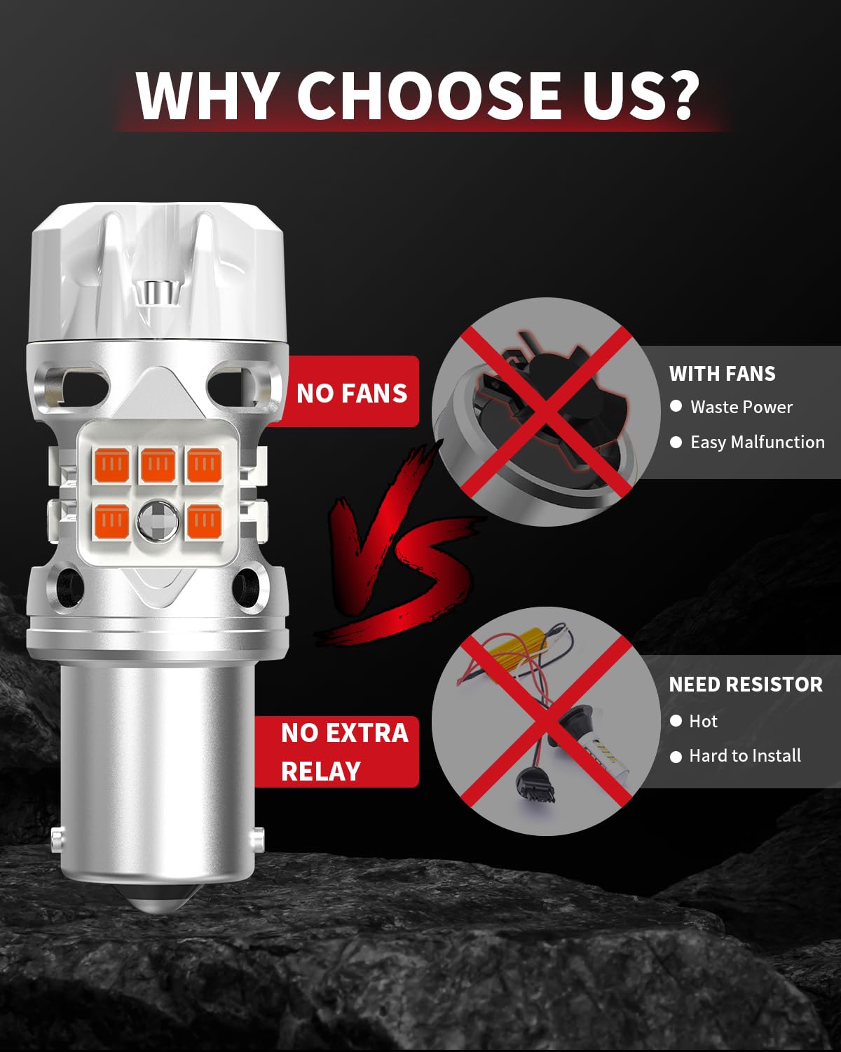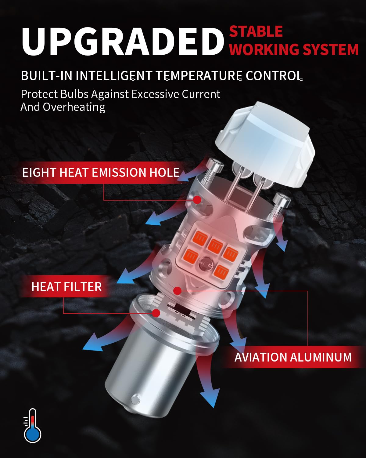 LONG LIFESPAN: The upgrade 1156 amber LED boast an Intelligent Temperature Control System (ITCS), ensuring optimal performance even on scorching days. Designed with an aluminum casing featuring a textured finish for superior heatsinking properties, these bulbs also include internal heat filter fins, further enhancing cooling capabilities. As a result, a longer lifespan is guaranteed