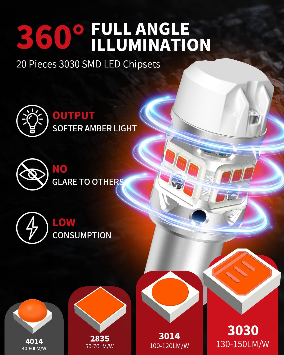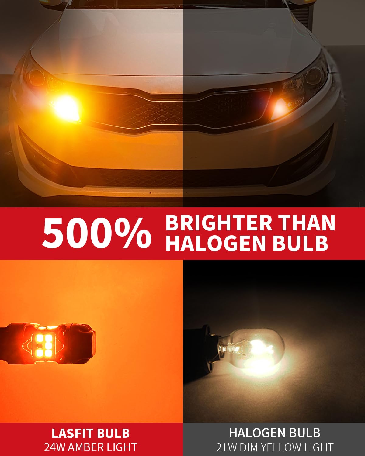 500% BRIGHTER: LASFIT T3 amber 1156 p21w led bulb are 500% brighter than halogen. They are equipped with 20pcs 3030 top-grade LED chips, resulting in a 360° full lighting effect.The 1156a bulbs provide 4000LM and 48W of lighting for every turn. The luminosity of all shop supply bulbs has been accurately measured, ensuring a visually appealing driving experience with vibrant colors