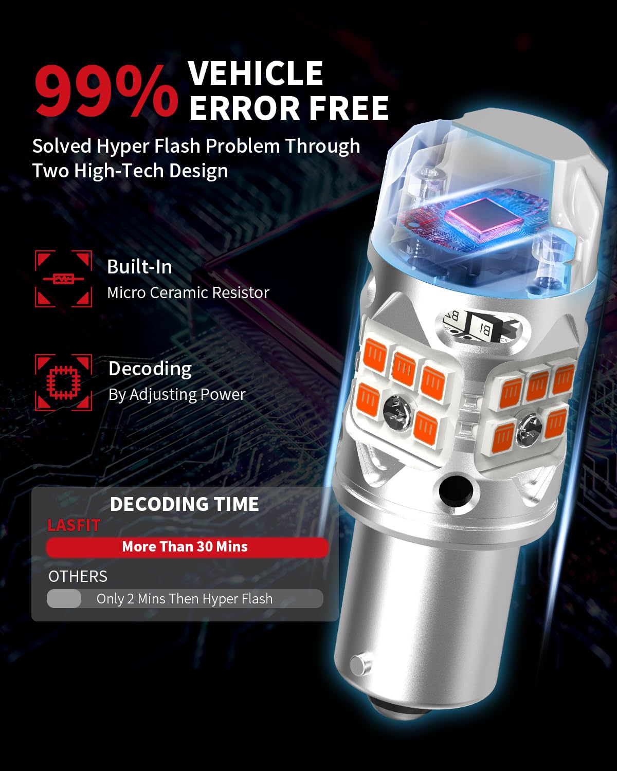 99% CANBUS READY ERROR FREE: LASFIT 1156 amber bulbs are designed to work seamlessly with 99% of vehicle computer systems, thanks to the upgraded built-in resistor. After numerous tests, LASFIT has taken another leap forward by eliminating the need for annoying additional resistor. Your vehicle receives a truly advanced 1156 turn signal bulb, and you can say goodbye to worries about hyper flash