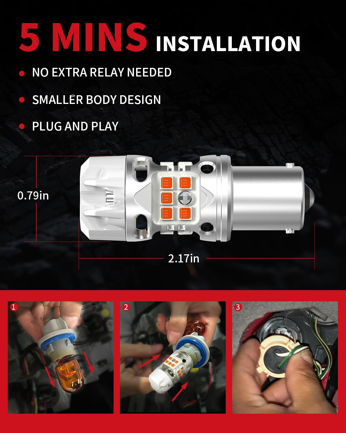 5-MIN PLUG & PLAY: You can replace the 1156 turn signal bulbs within 5 minutes without any modification, no hyperflash, anti-flicker and no need extra decoder.These bulbs are specifically designed based on the OEM halogen bulbs socket, ensuring a perfect fit into your housing. Fit for 1156 1003 BA15S P21W 1156A 1156NA 1073 1129 1141 1159 1259 1459 1619 1651 1680 5007 5008 7506 7527 Front Rear Turn Signal Bulb DRL Light