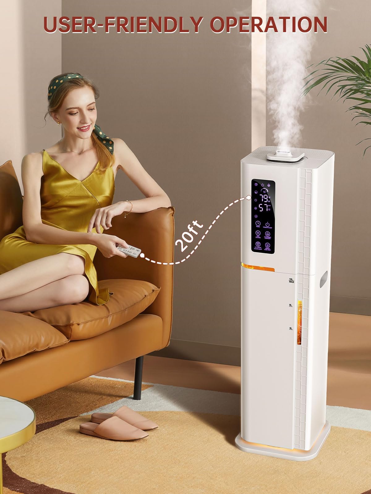 【One Humidifier for All Seasons!】This versatile humidifier features both cool and warm mist options, making it ideal for year-round use. Enjoy a refreshing cool mist during hot summer days, while the soothing warm mist provides comfort during chilly winter nights. Its gentle formula is skin-friendly and disperses quickly for maximum relief. Additionally, this humidifier includes several thoughtful design :1.Top-Fill Design; 2.Visual Water Level Window; 3.LED Control Panel; 4.Remote Control.
