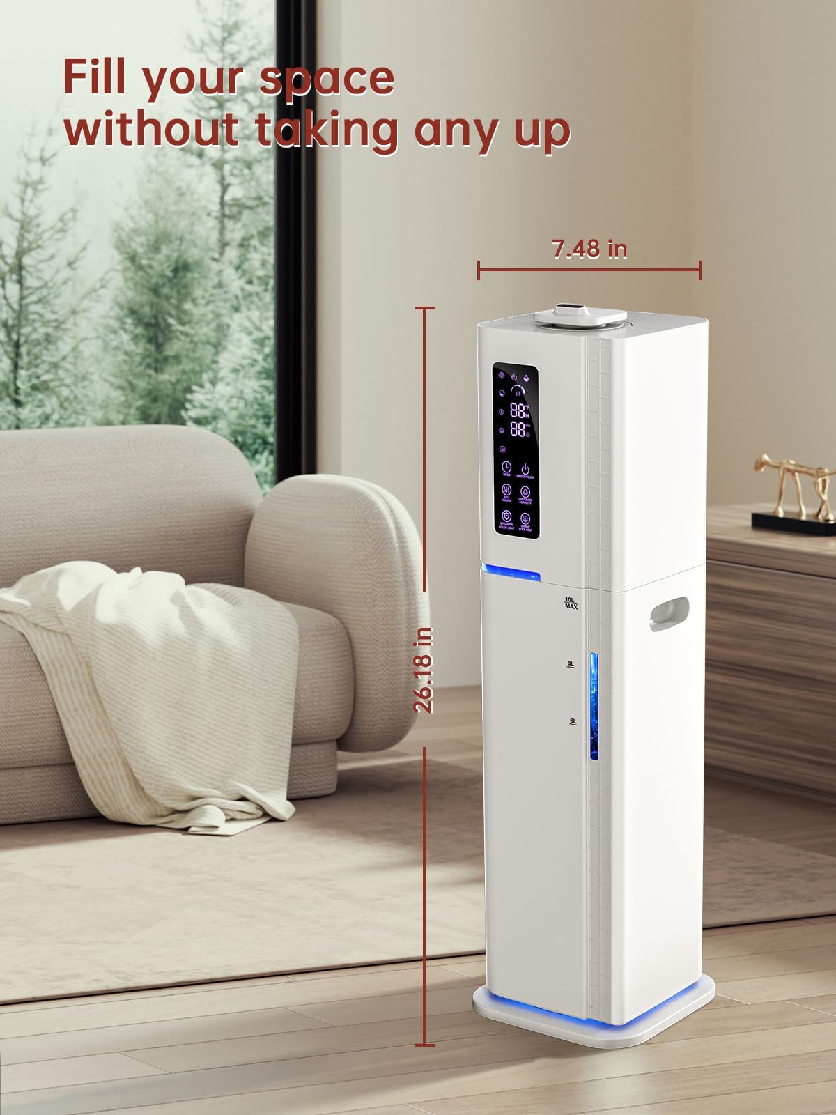 【Ultimate Humidifying Solution】The JS2325 bedroom humidifier ensures rapid humidification with a warm mist that reaches 120°F in just 5 minutes, providing immediate relief from dryness. It features a large 2.64Gal water tank, capable of producing a powerful mist output of 500ml/h for rooms up to 500ft², allowing for up to 60 hours of continuous use on low mode. With a 7.48 x 7.48 x 26.18 inches sleek, compact design, it blends effortlessly into any room without taking up too much space.