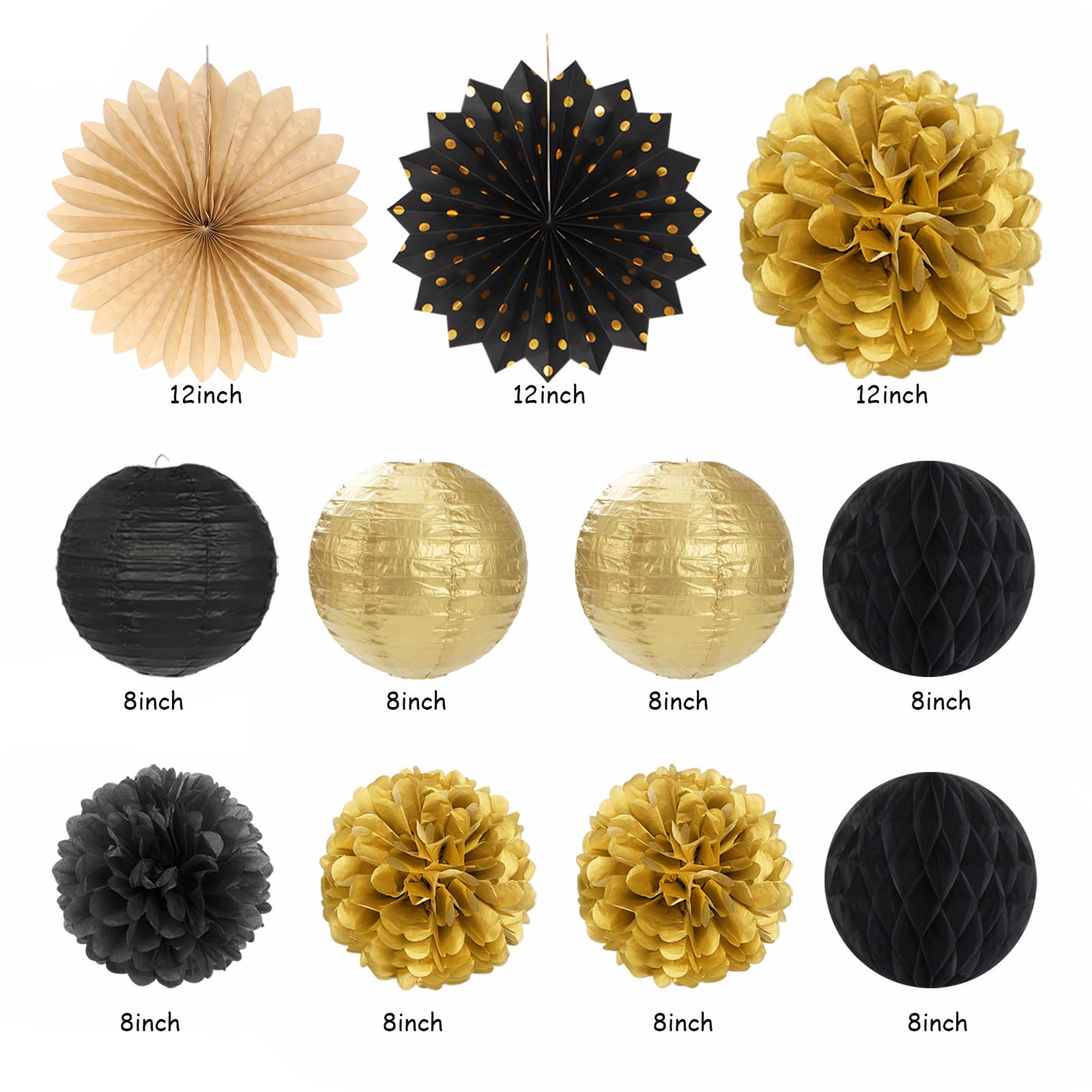 【Black Gold Birthday Party kits】This kits include 1pcs happy birthday banner, 1pcs circle dots paper banner, 4pcs tissue pom poms: 3pcs 10" and 1pcs 12" , 3pcs 8inch paper honeycom ball, 2pcs 8inch paper lantern, 4pcs 12inch paper flower fan, 6pcs Paper swirls hanging streamers