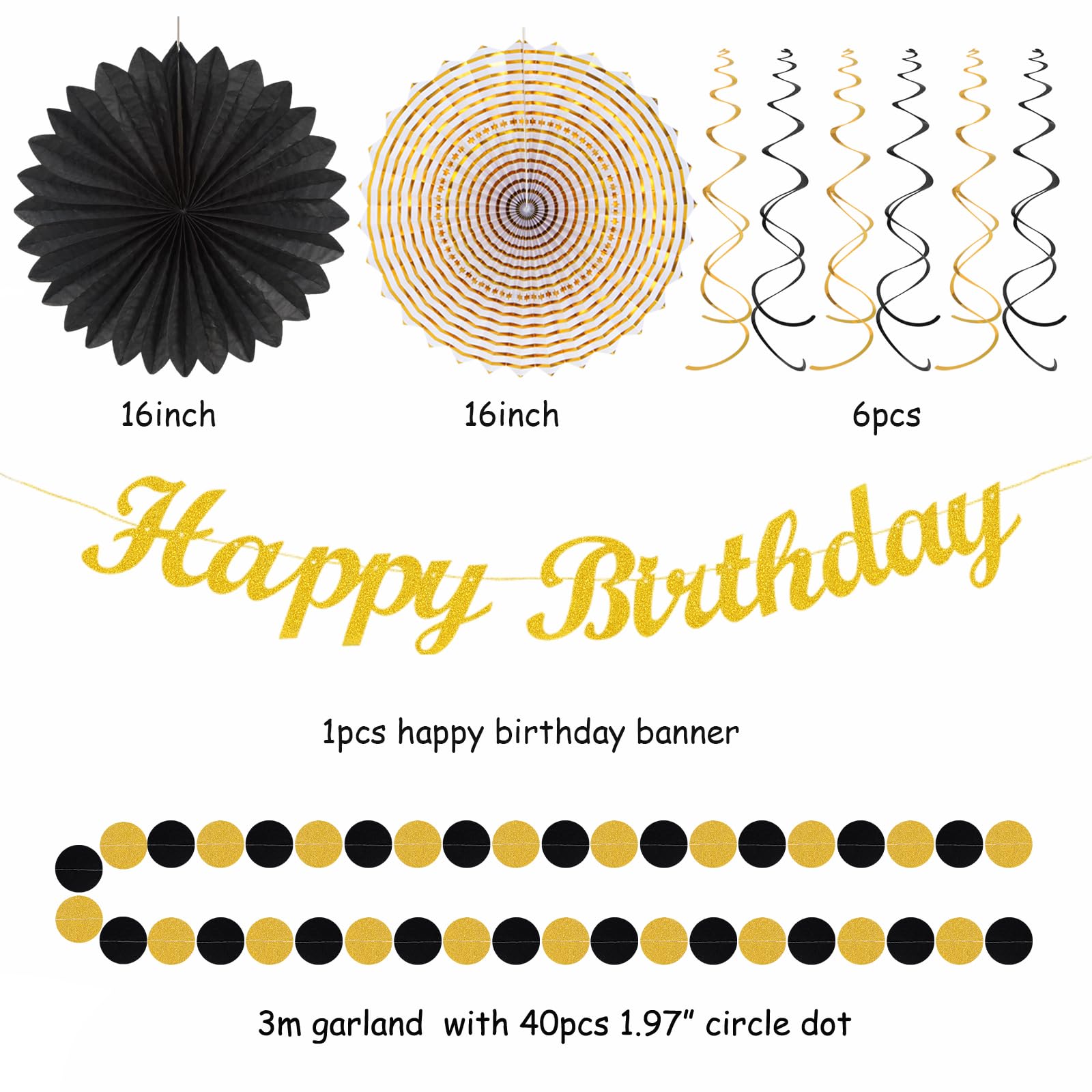 【Wide Application】This birthday kits have been used for all kinds of parties and special occasions Perfect for 5th 7th 8th 10th 12th 13th 17th 18th 20th 21st 22nd 26th 28th 30th 50th 60th 80th birthday decorations,Party decorations for women and mens,adult and kids,classroom birthday celebration decoration,black and gold party decorations.