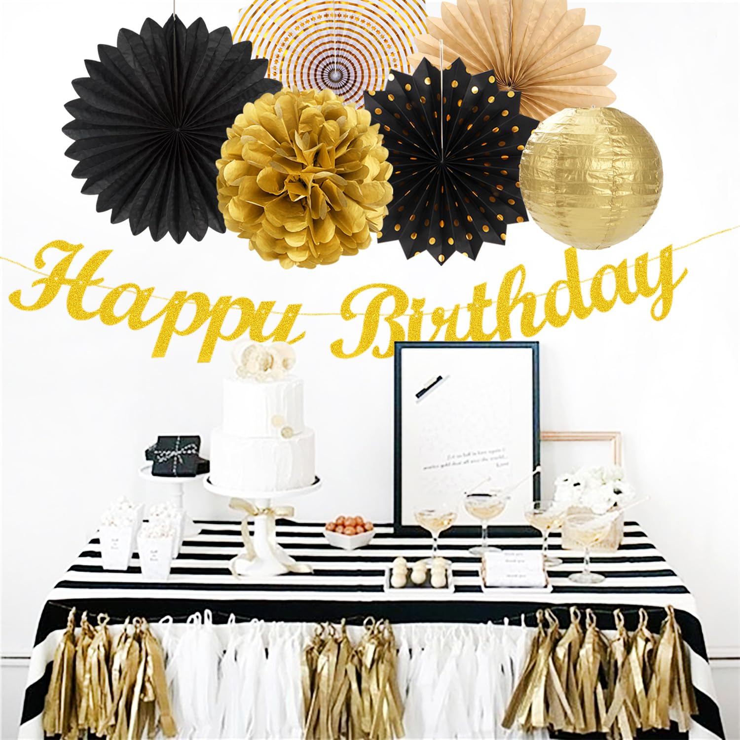 【Black Gold Birthday Party kits】This kits include 1pcs happy birthday banner, 1pcs circle dots paper banner, 4pcs tissue pom poms: 3pcs 10" and 1pcs 12" , 3pcs 8inch paper honeycom ball, 2pcs 8inch paper lantern, 4pcs 12inch paper flower fan, 6pcs Paper swirls hanging streamers 【Unique Birthday Party Decoration design】Black gold color, use our high-quality paper decorations at your party table and give your guests the details they deserve. It will be a great addition to the retirement theme party. 【Wide Application】This birthday kits have been used for all kinds of parties and special occasions Perfect for 5th 7th 8th 10th 12th 13th 17th 18th 20th 21st 22nd 26th 28th 30th 50th 60th 80th birthday decorations,Party decorations for women and mens,adult and kids,classroom birthday celebration decoration,black and gold party decorations. 【Easy to Assemble】The paper fan and paper lanterns are easy assemble, the banners can be diy, the circle dots paper banner has been assembled but tissue paper pompoms take more time to put together, please diy with the instructions. It will take about 20 minutes in total. 【Quality Guarantee】If you are not satisfied with the color, quality or other aspects,please contact us for a refund or replacement. We have a 30 day refund guarantee for every order.