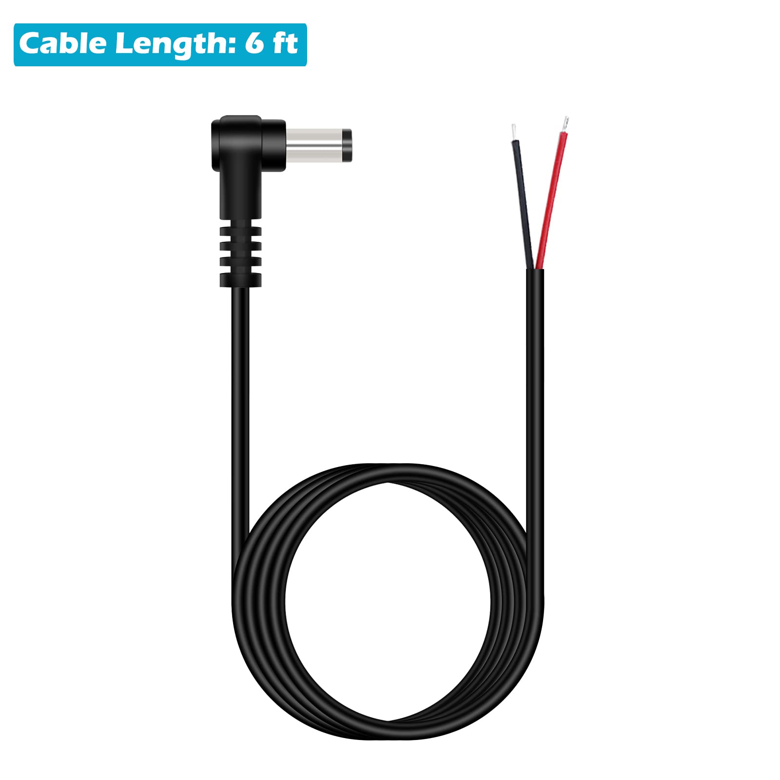 L-Shape replacement 5.5mm x 2.5mm DC power supply repair cable, 90 degree right angle plug to bare wire open end pigtail power cord. The 90 degree right angle plug jack repair cable can be easily go through the narrow gap, will never bend and damage the power supply cord. This 5.5mm x 2.5mm DC power repair cord widely used for worn-out or broken power cable, such as wireless IP camera CCTV security camera surveillance standalone DVR LED low voltage application system etc. Black color, the cable length is 6 ft. The wire gauge is 22 AWG. Wiring diagram: Inner - Red wire; Outer - Black wire. Package contents: 2-Pack 5.5mm x 2.5mm 90 degree right angle DC power plug to bare wire open end pigtail repair power cable cord.