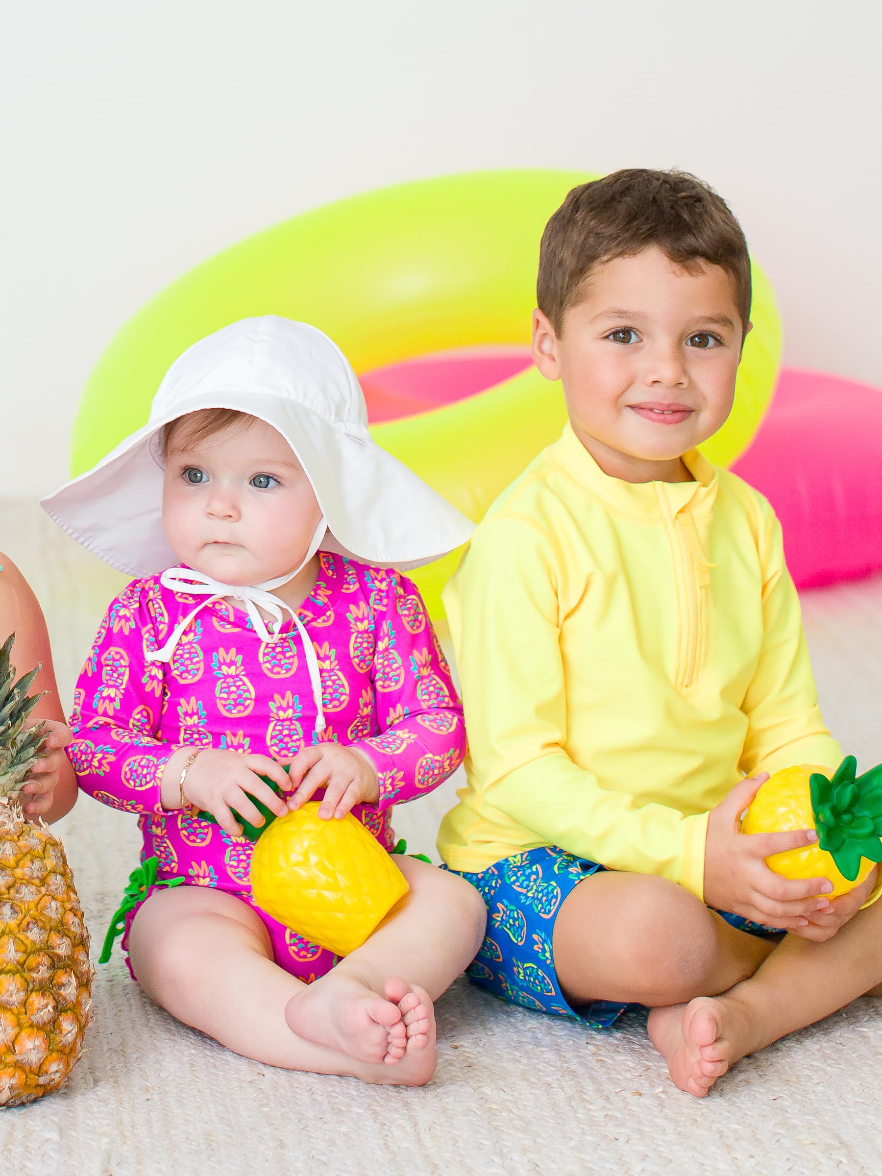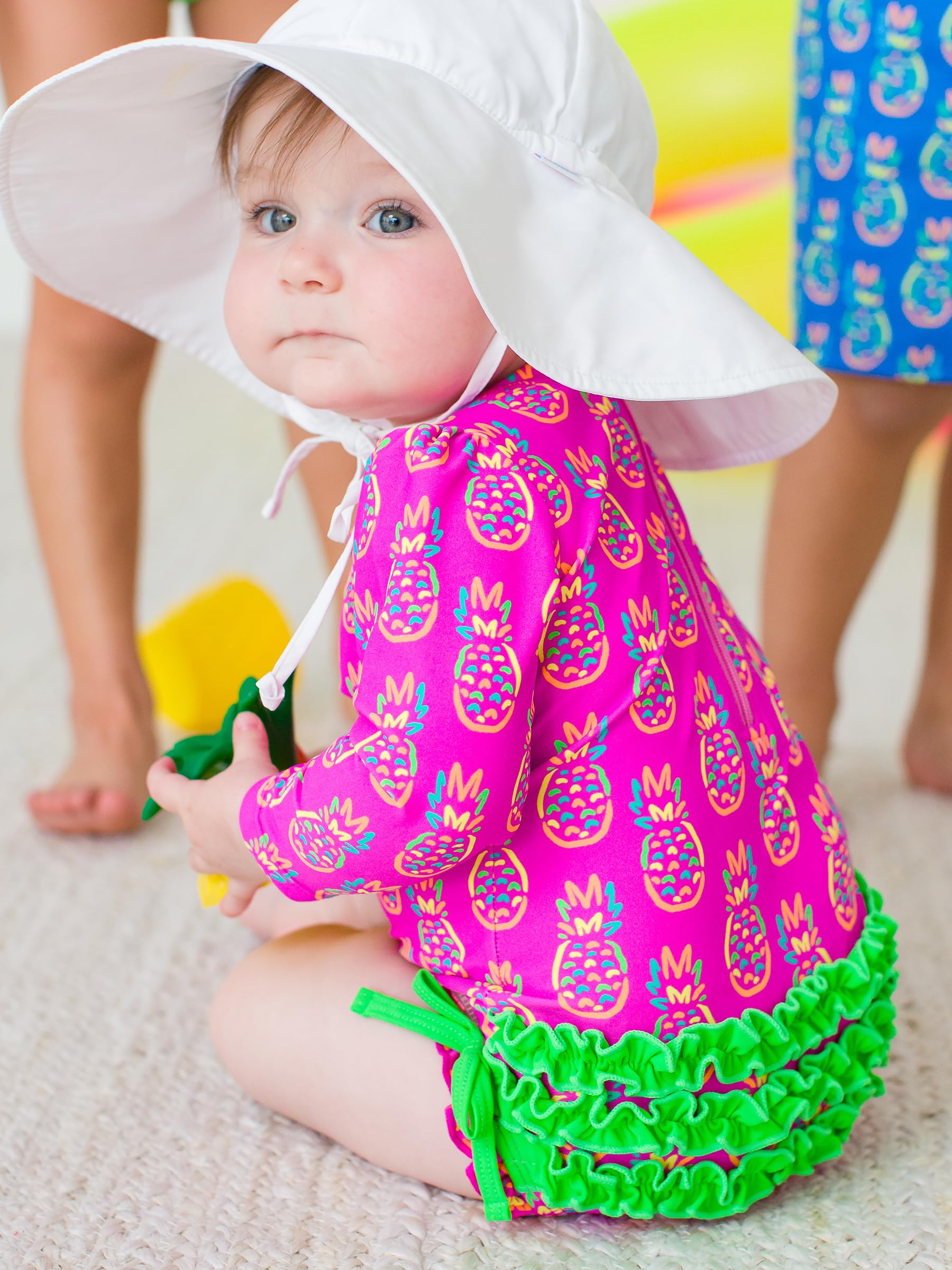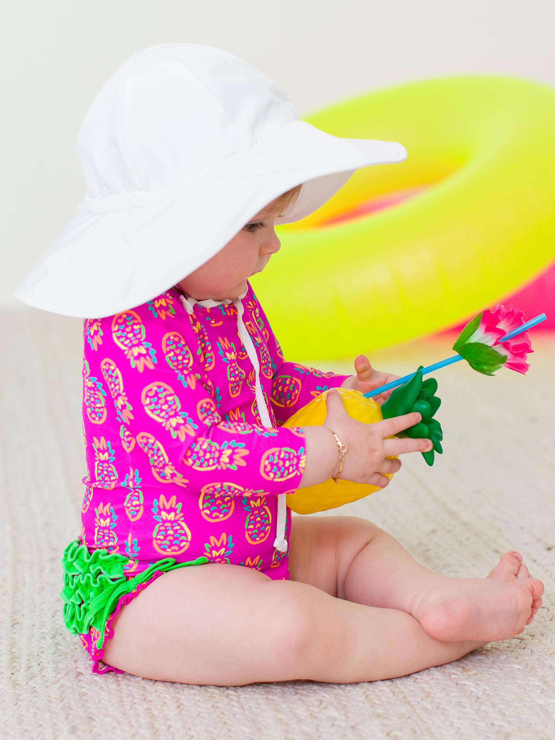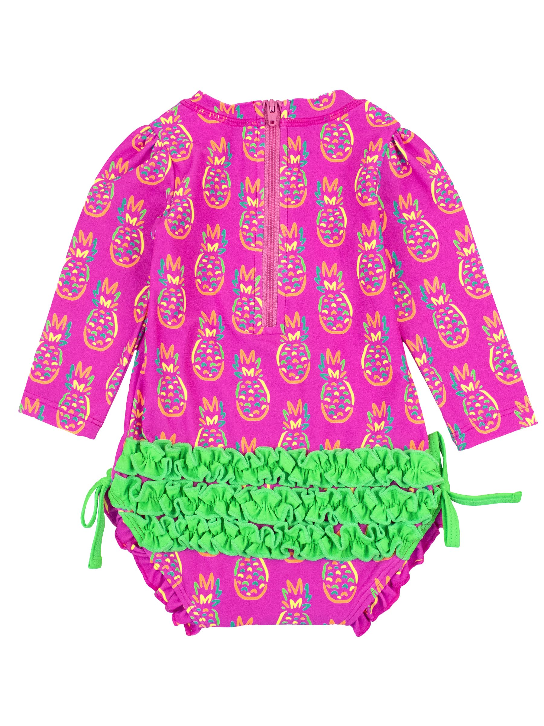 Description A wonderful addition to your little girl's swimwear, this Tropical Baby One Piece Rash Guard is comfort and style rolled into one. Unlined with snaps at bottom that make for easy changing. Made with sun protected fabric for all day protection and comfort.