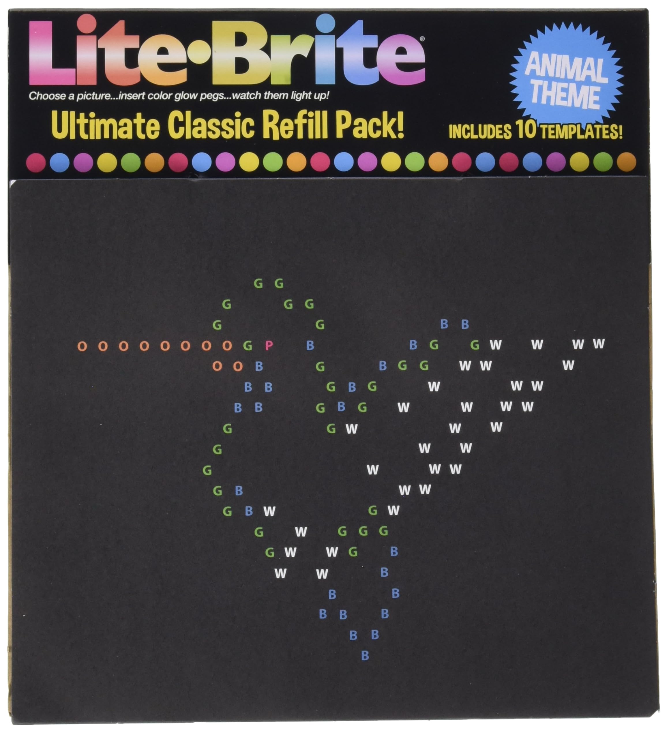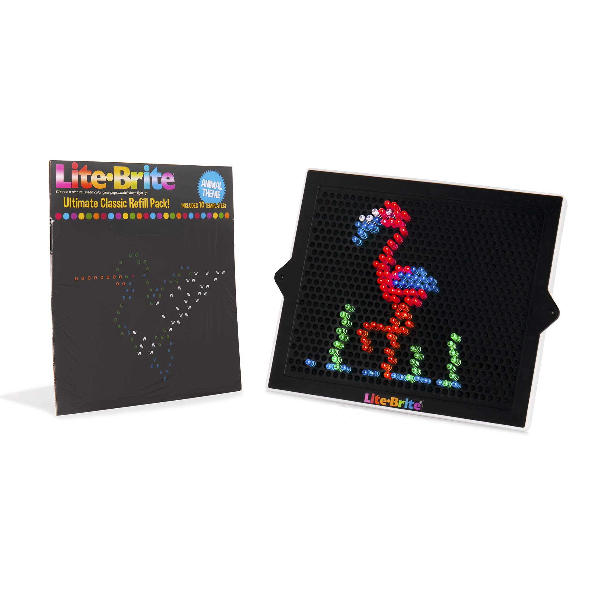 Lite-Brite has been a family favorite for generations and is now more fun, creative, and inspiring than ever! This refill pack offers a variety of new, animal theme templates specifically designed for the Basic Fun Lite-Brite Ultimate Classic unit. Includes 10 reusable design templates featuring Kitty, Puppy, Fish, Turtle, Hummingbird, Cardinal, Dragonfly, Orca Whale, Flamingo and Starfish designs! Ultimate Classic unit sold separately. Ages 4+. Helpful Tips: o Designed to fit the 2018 & newer Basic Fun Lite-Brite Ultimate Classic unit (white exterior with black board sized 9. 25â � wide with on/off button located on the back of the unit); o Templates will fit Basic Fun Lite-Brite units from 2014-2018, but may need to be cut to size for certain models and artwork may not line up perfectly on the peg grid; o More templates can be downloaded on Basicfun