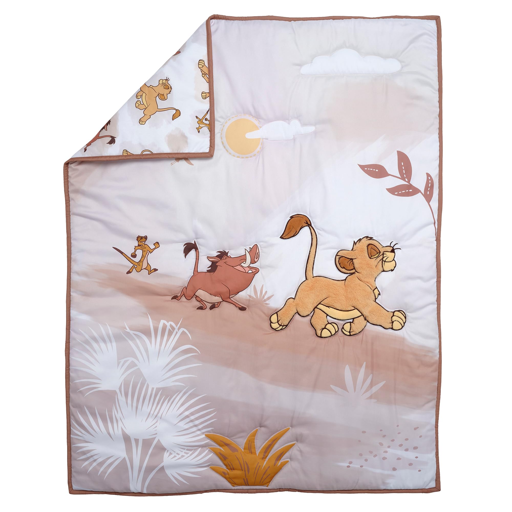 Features Simba, appliqued in a golden apricot faux fur, Pumbaa, and Timon under a golden sun and vanilla sky