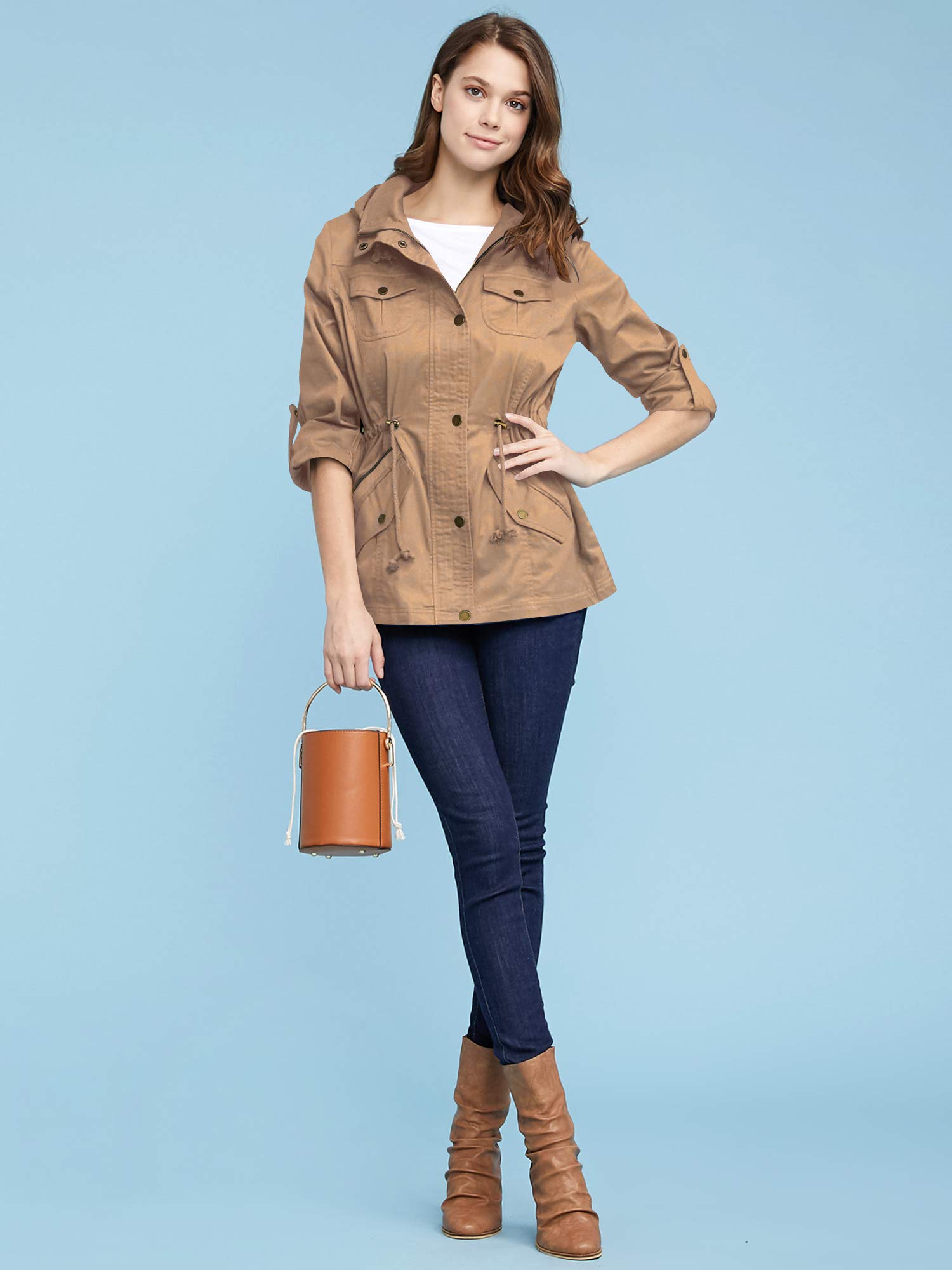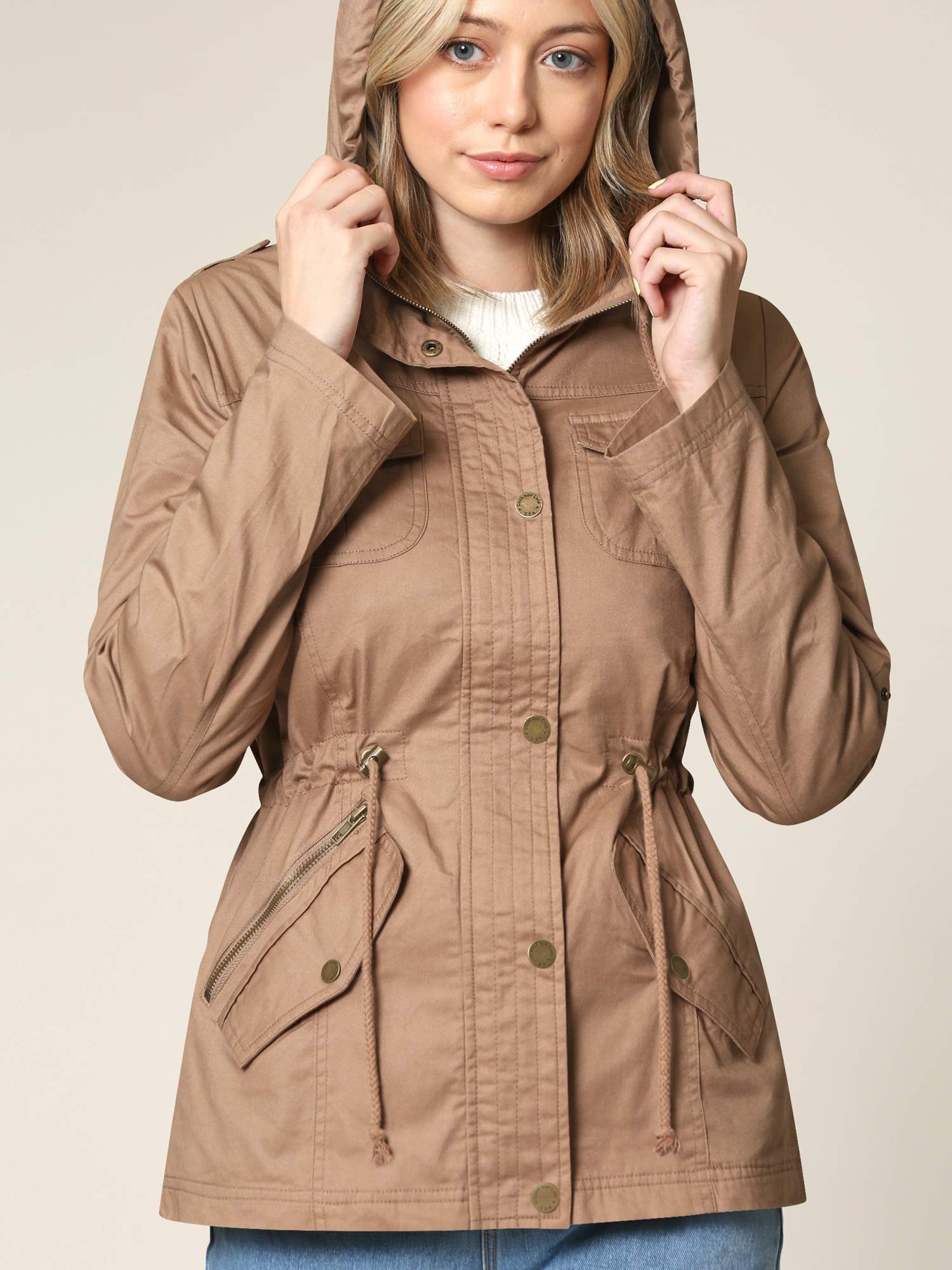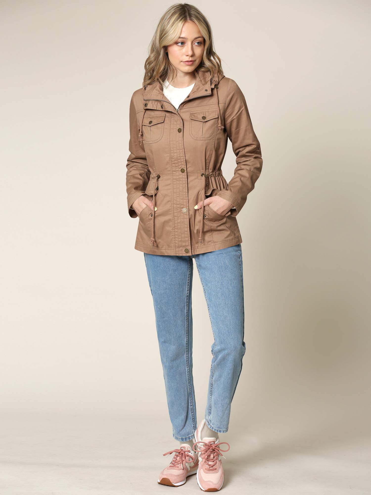 Stylish and functional Women's Casual Military Anorak Jacket Safari Utility with a detachable hoodie for versatile wear.