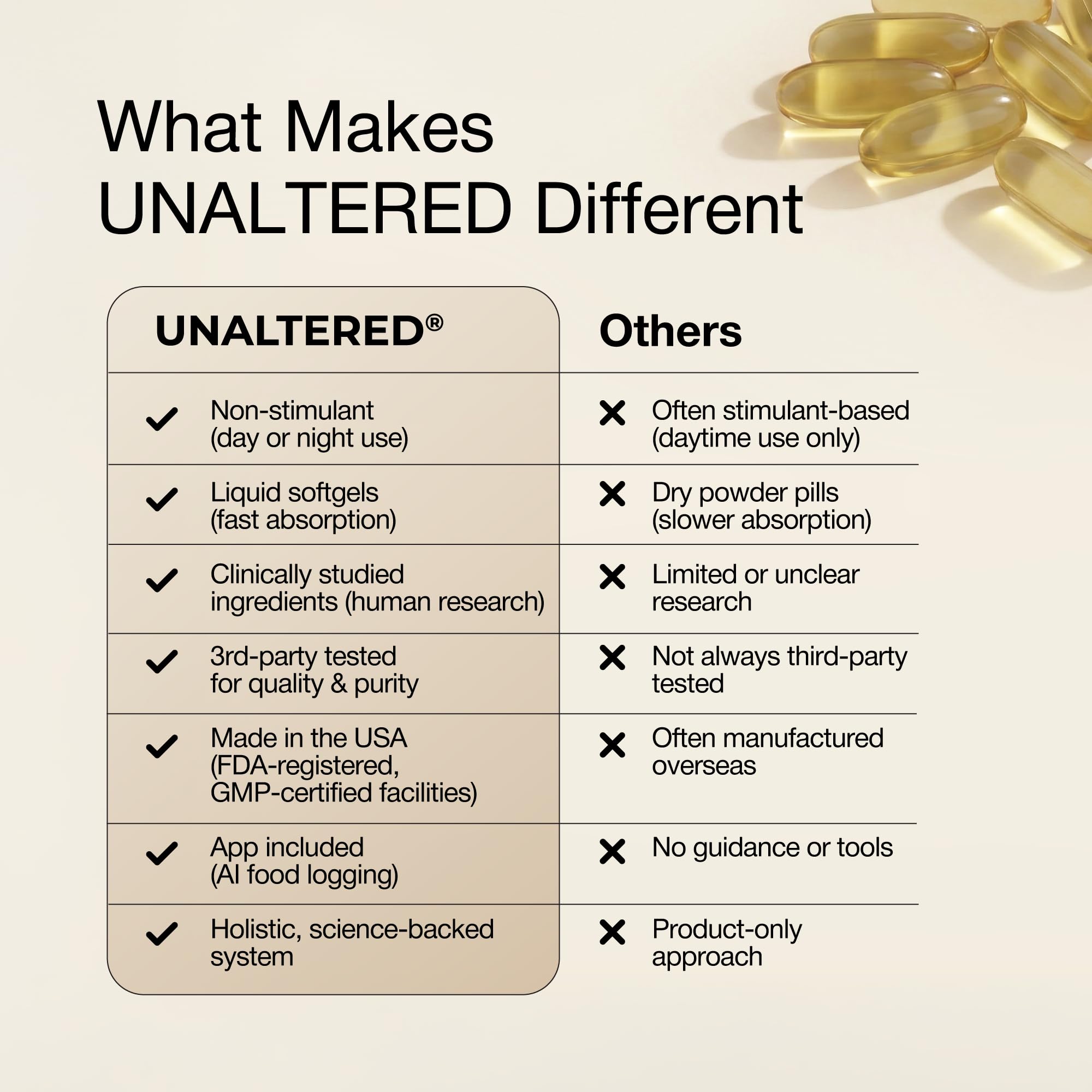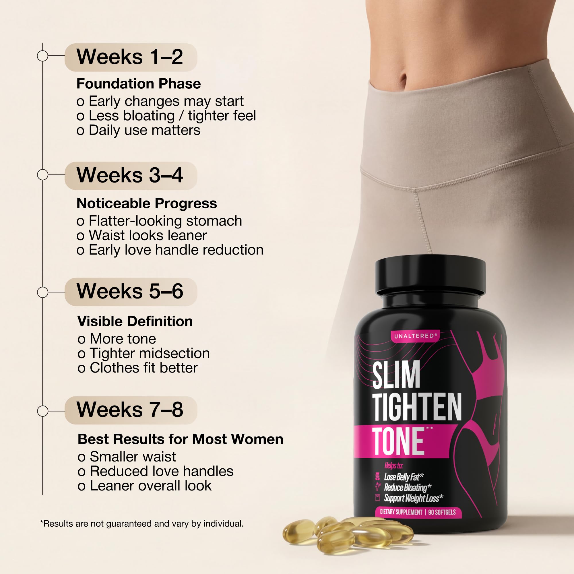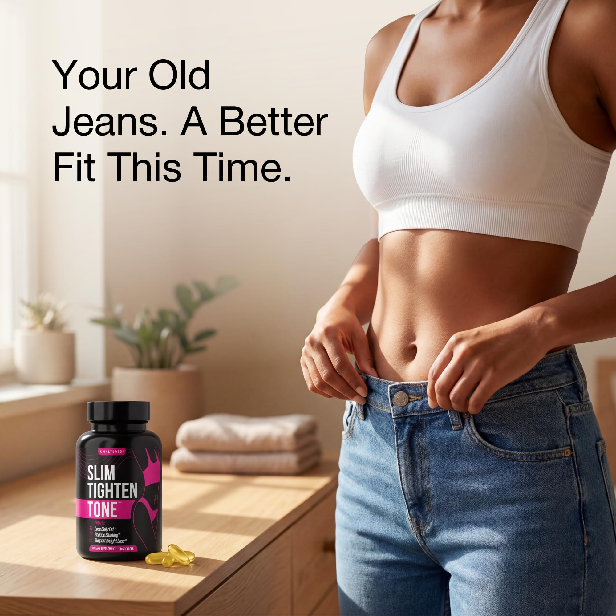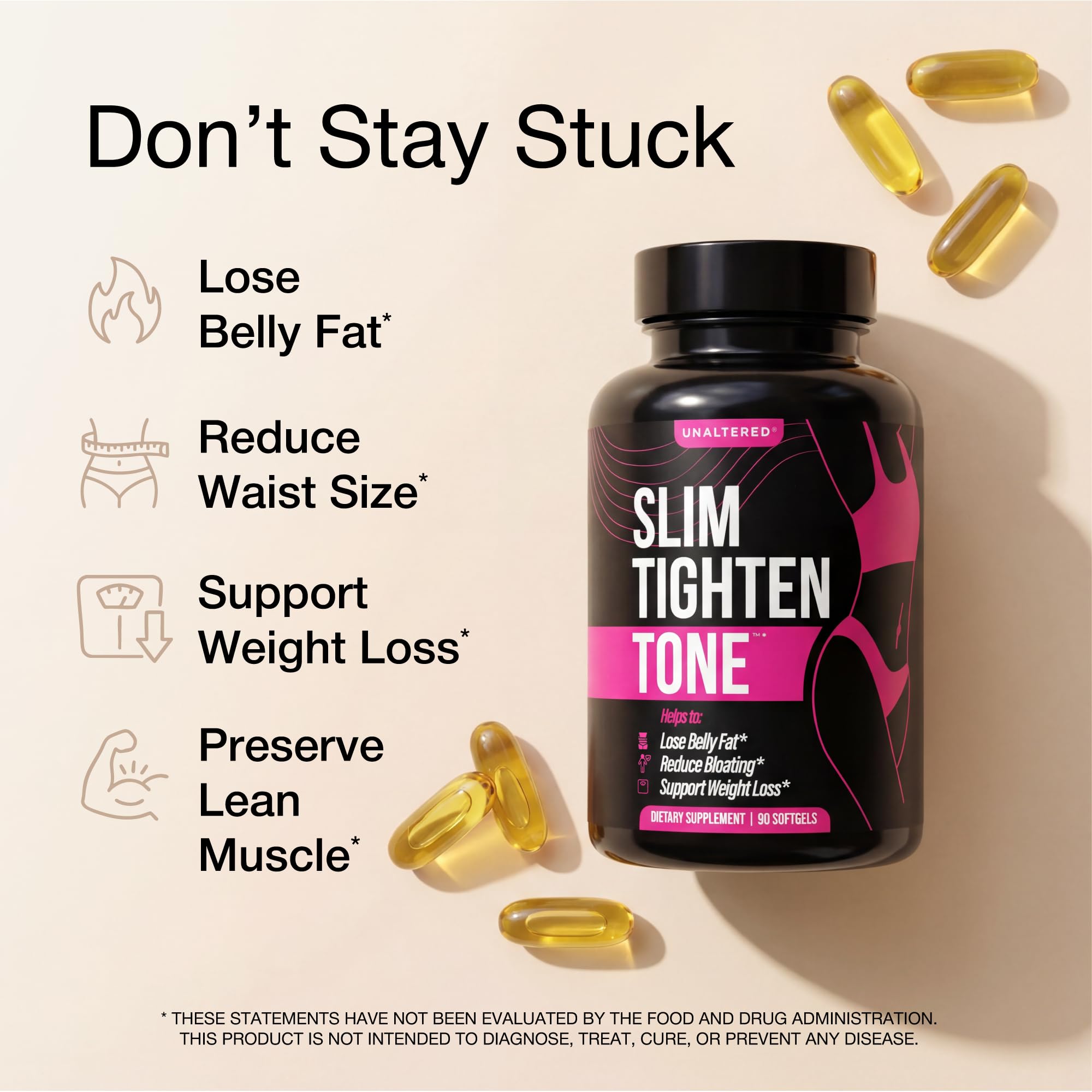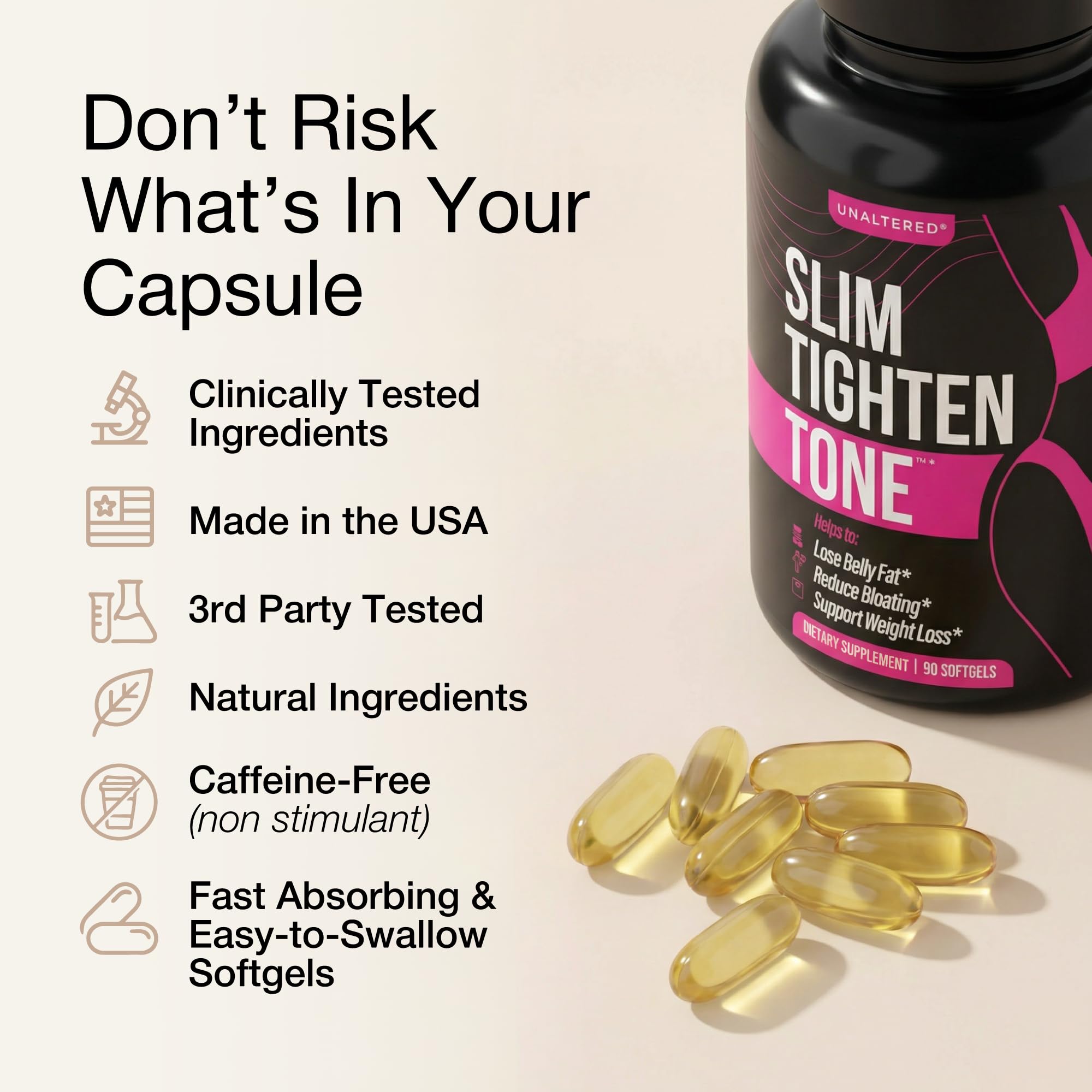 Easy-to-Swallow Softgel Capsules - UNALTERED Slim Tighten Tone uses soft, gentle, softgel capsules for easy use*