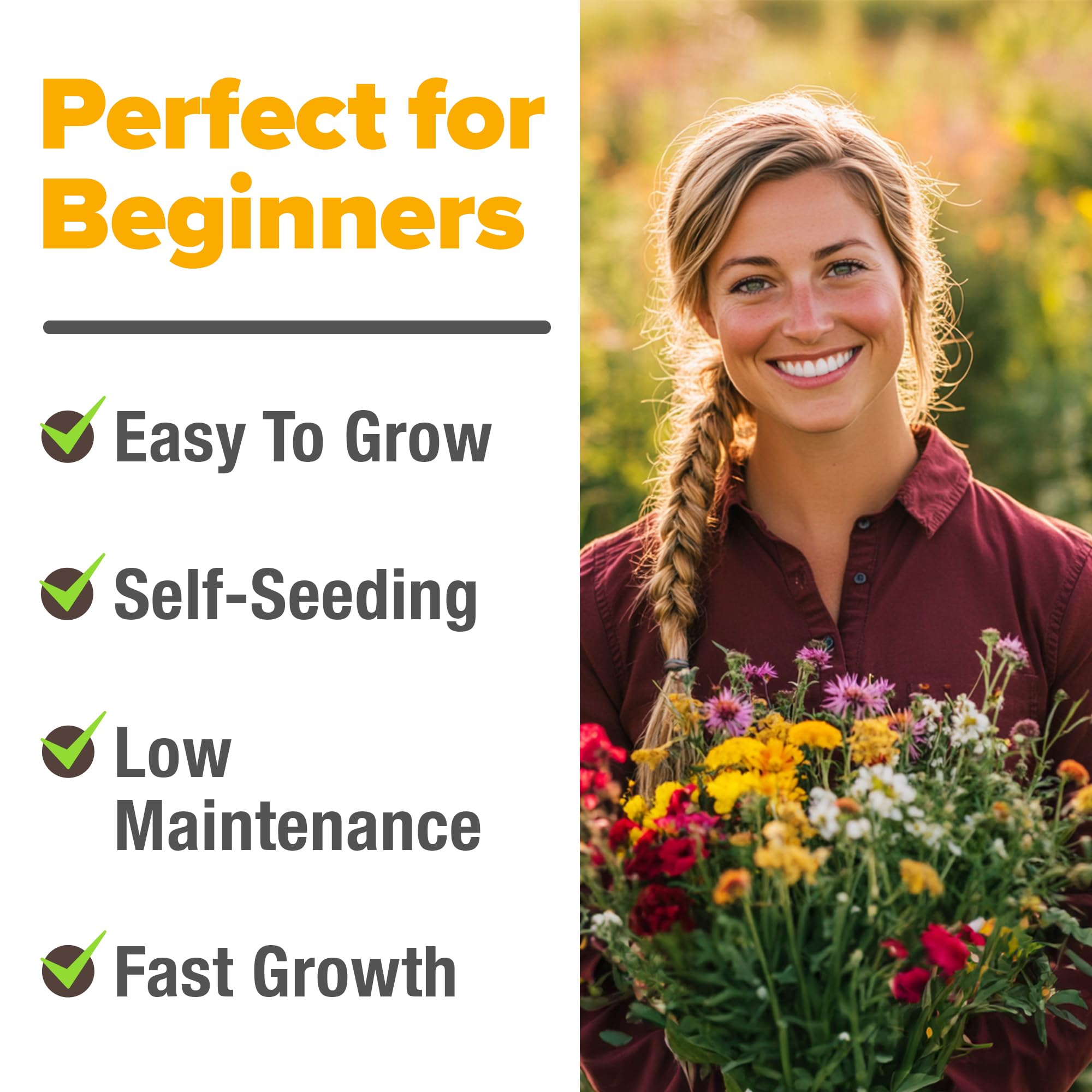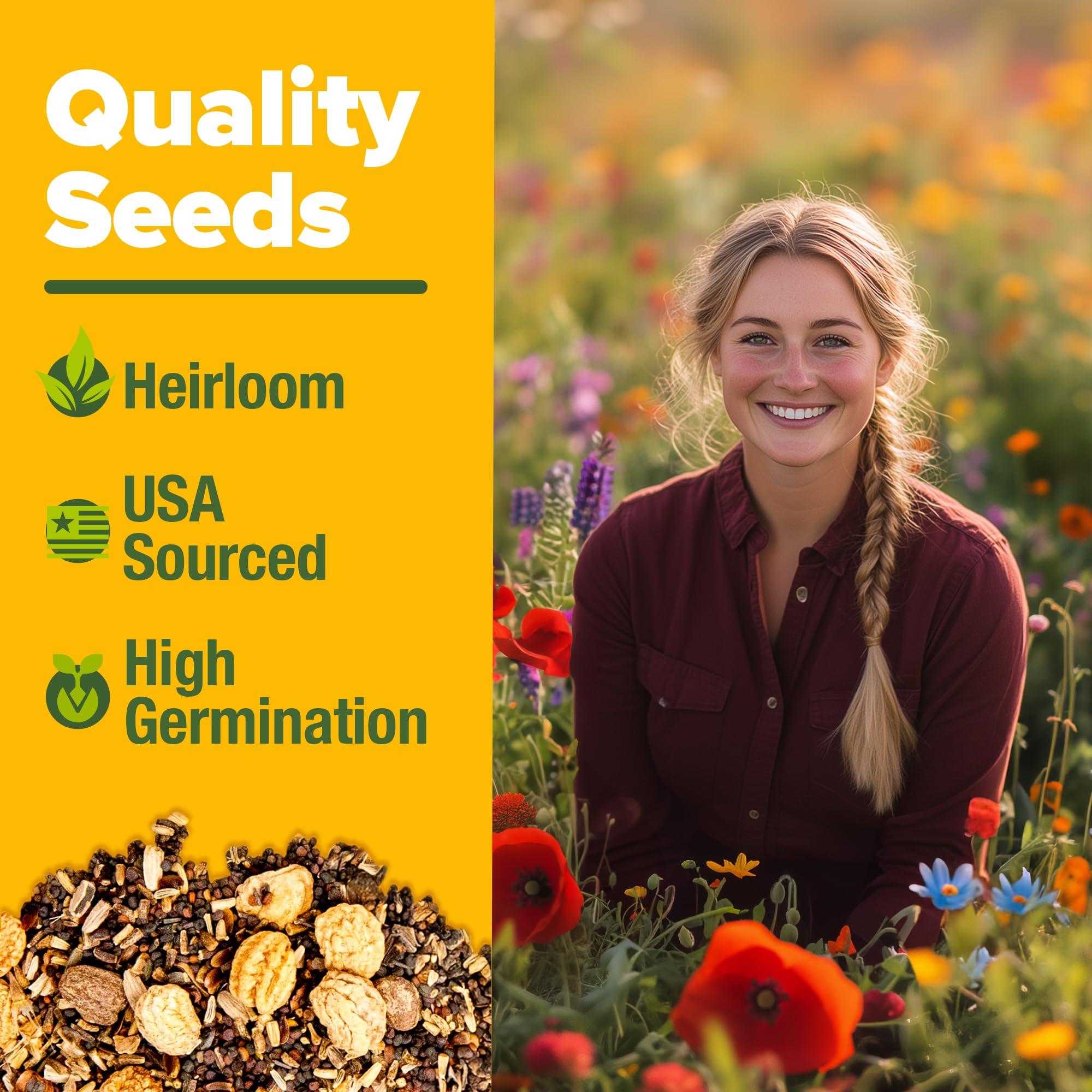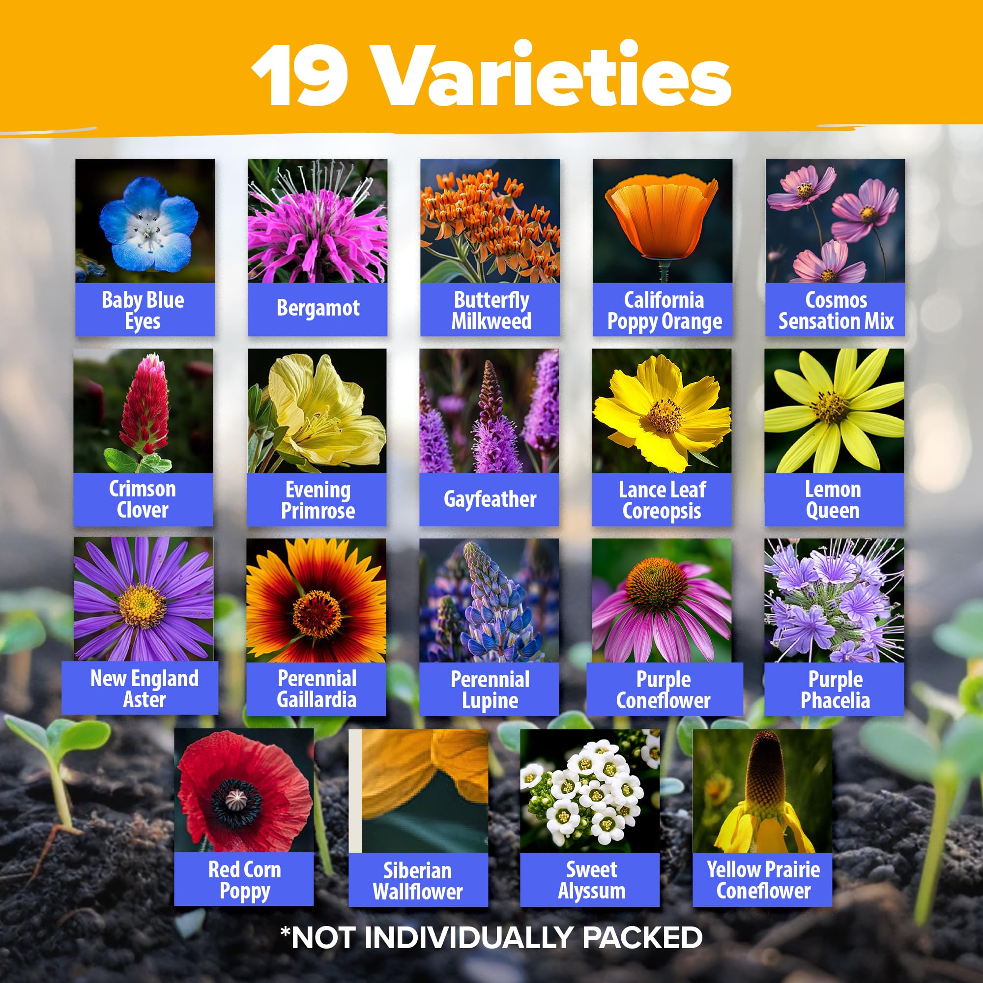 COMPLETE WILDFLOWER SEED MIX: Contains 19 varieties of perennial and annual wildflowers; Over 59,300 premium seeds with no fillers; Perfect pollinator seed mix that attracts bees, butterflies, and hummingbirds; USA-sourced for best adaptation to American gardens